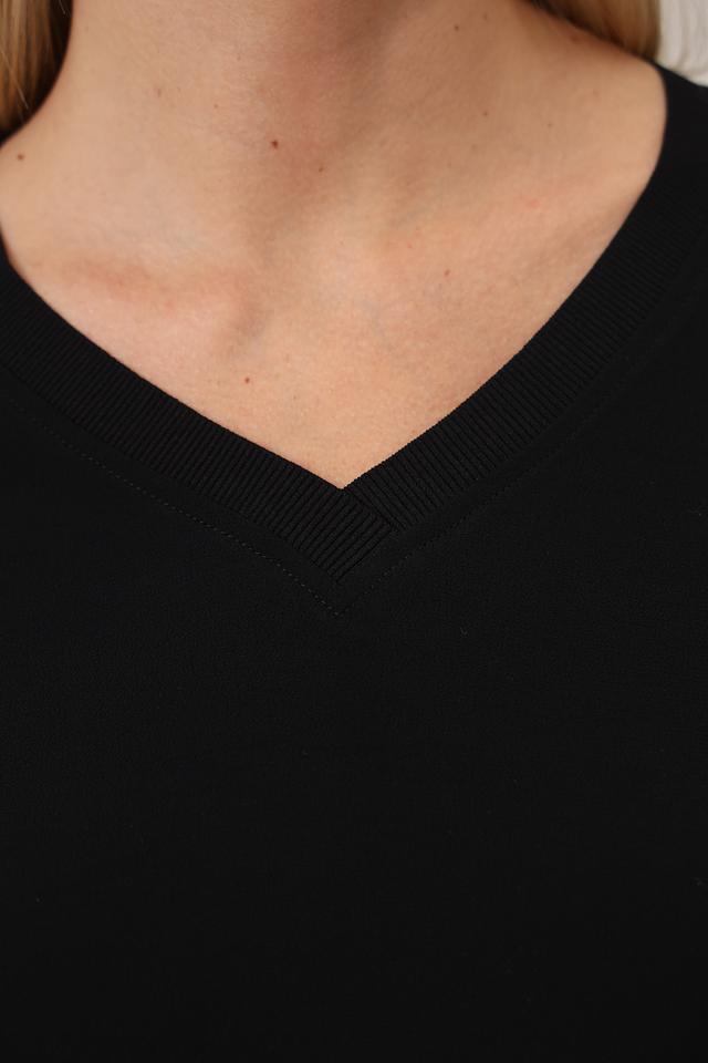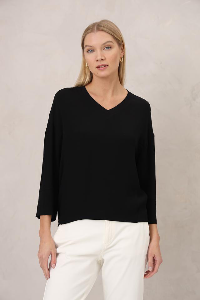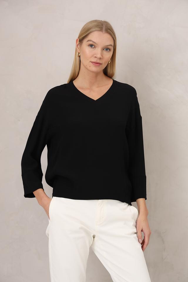 Чёрная блуза от Margittes выполнена из мягкого лиоцела и имеет удобный V-образный вырез. Эта модель с рукавом 3/4 станет отличным дополнением к вашему гардеробу, сочетая в себе комфорт и элегантность. Состав: лиоцел 100%
