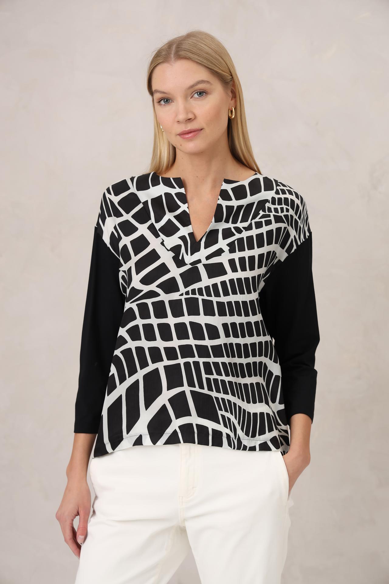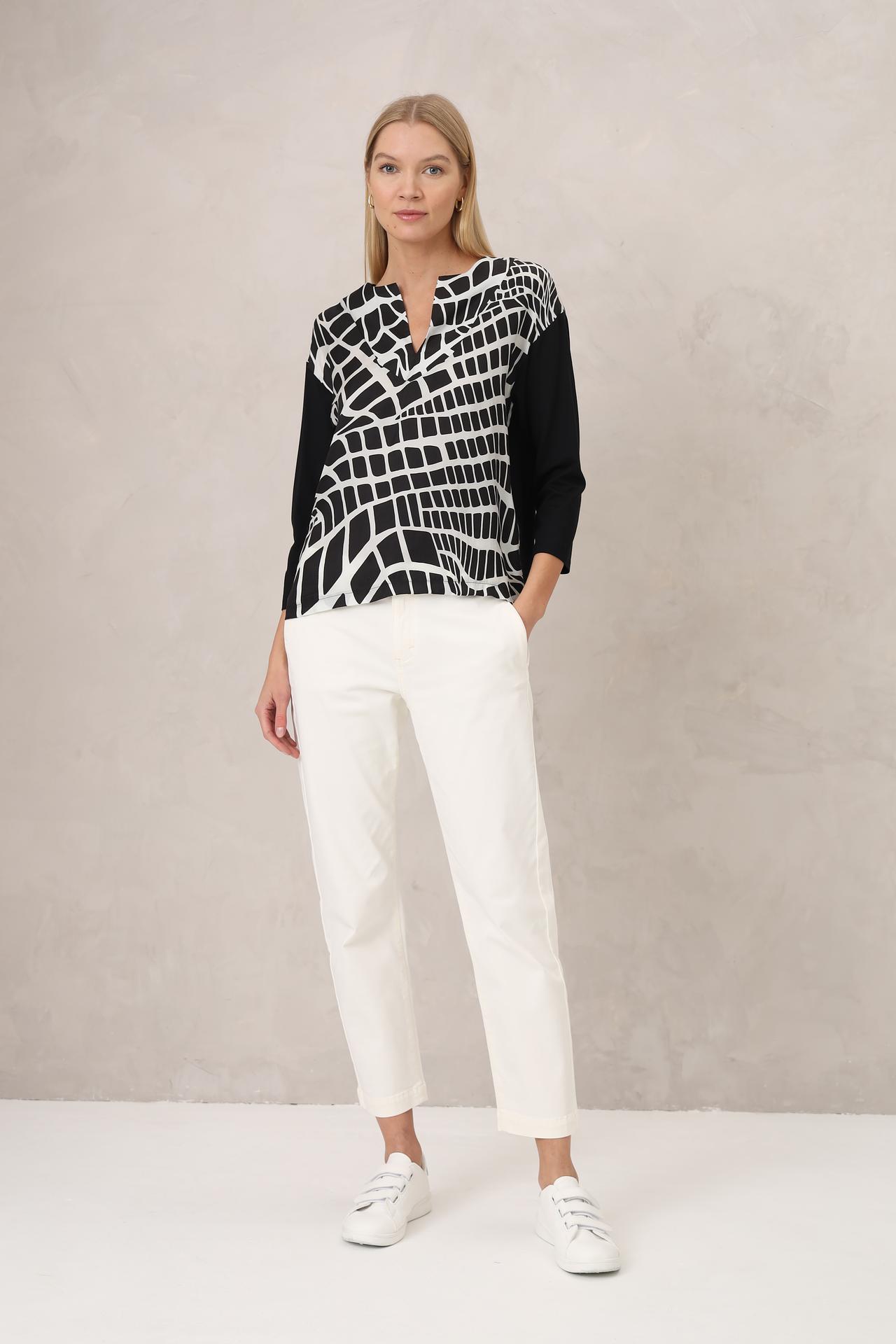 Блуза Margittes – это идеальное сочетание элегантности и комфорта. Модель выполнена из 100% лиоцелла, приятного на ощупь и обладающего дышащими свойствами. Оригинальный геометрический принт в чёрно-белой гамме придает образу динамичности и современности. Удобный крой и V-образный вырез горловины обеспечивают свободу движений.