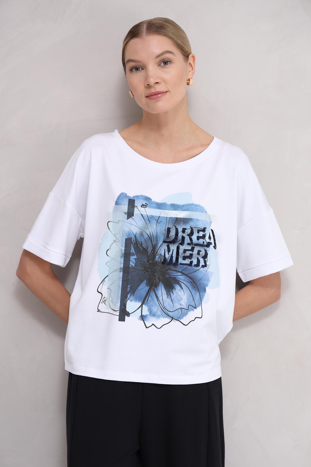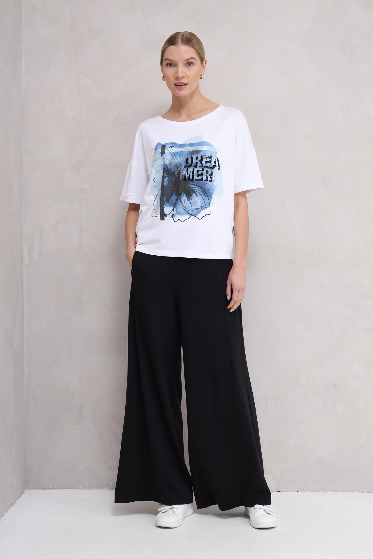 Белый цвет и оригинальный цветочный принт делают эту футболку прекрасным выбором для создания множества образов, от повседневных до более элегантных. Она легко сочетается с джинсами, юбками и брюками, позволяя вам всегда выглядеть безупречно.