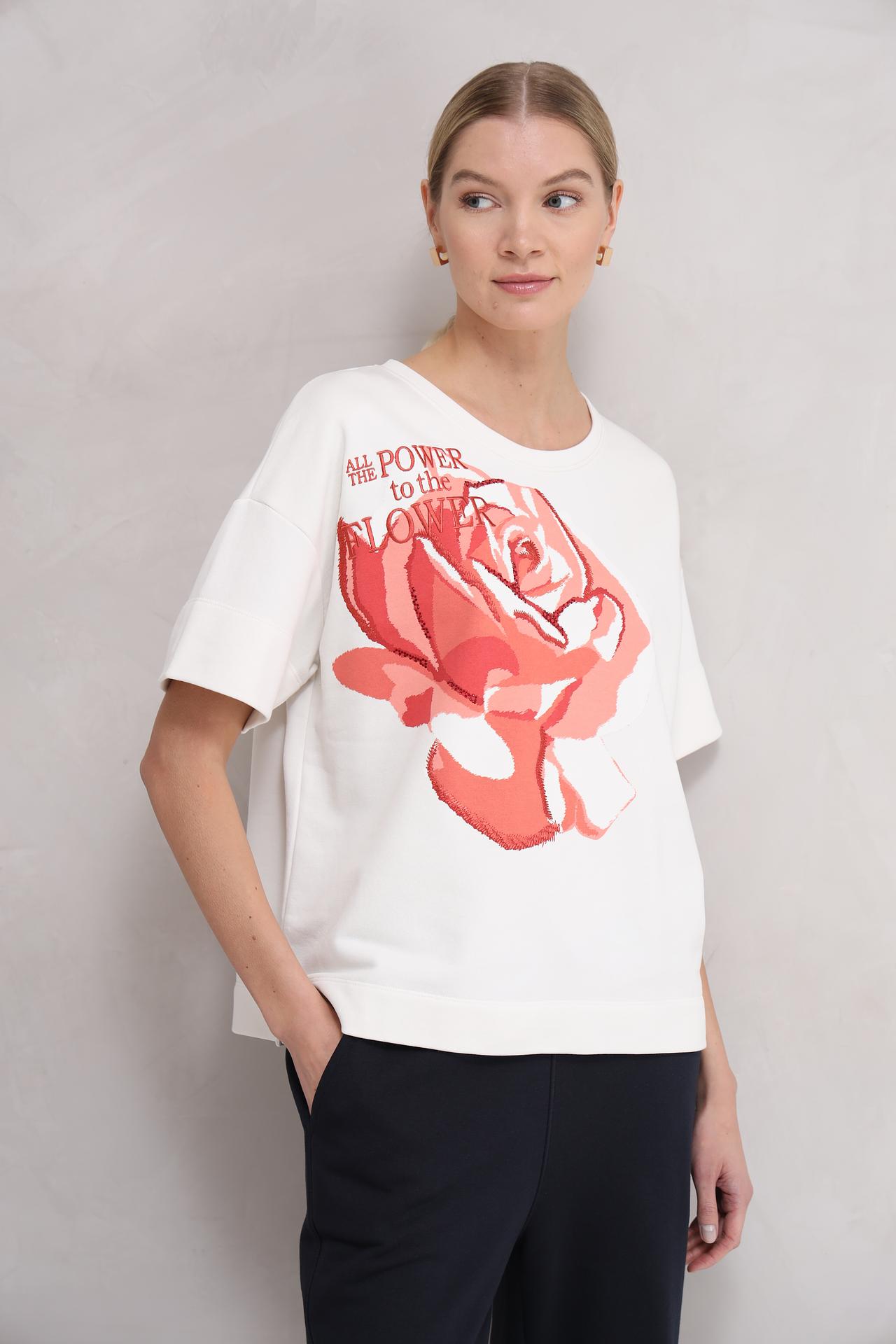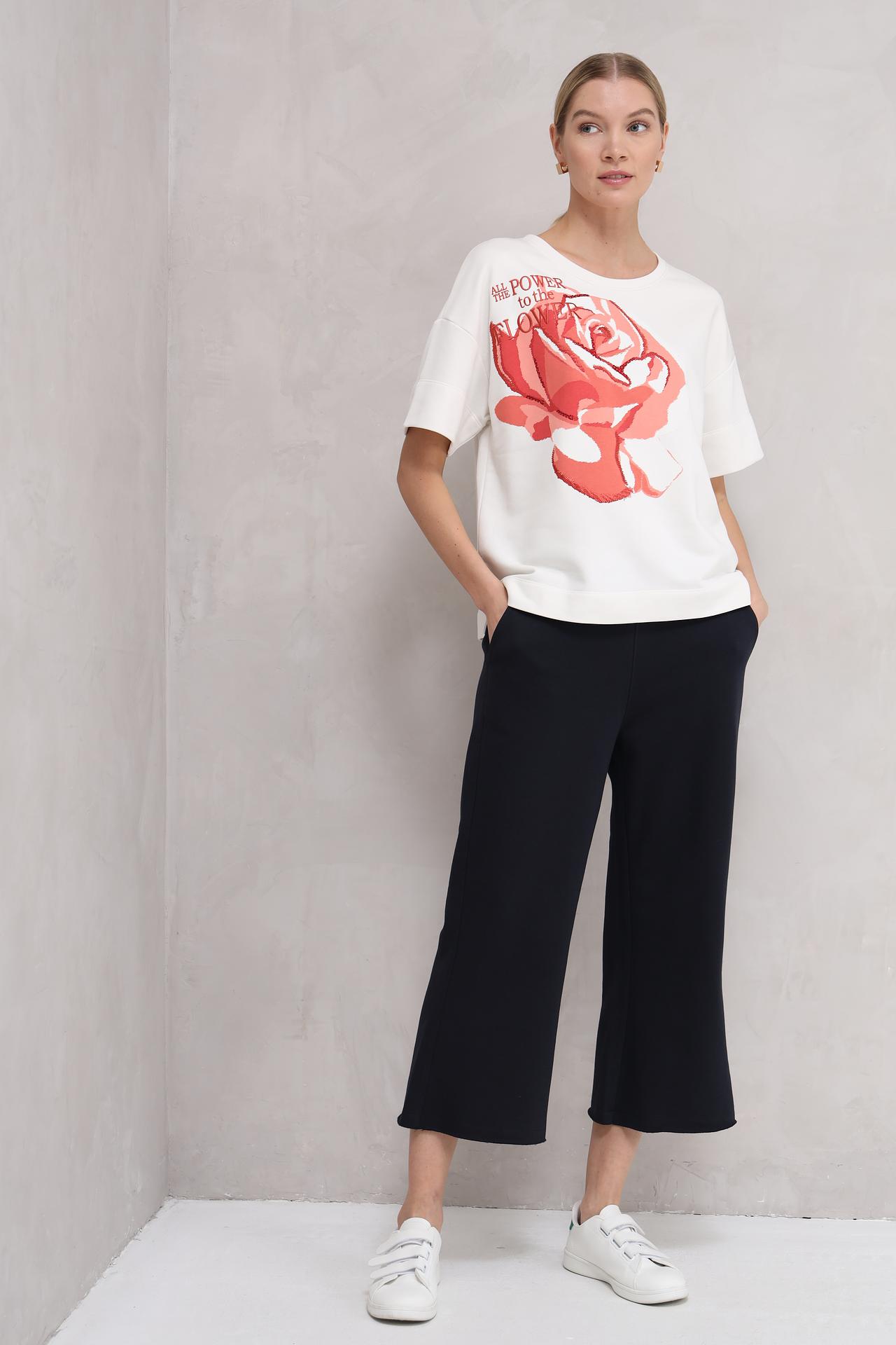 Женская футболка Margittes – идеальный выбор для создания стильного и комфортного образа. Модель выполнена из высококачественного дышащего трикотажа, обеспечивающего приятные тактильные ощущения. Дизайнерский принт в виде крупной розы и вдохновляющей надписи "ALL THE POWER to the FLOWER" делает эту футболку ярким акцентом в гардеробе. Это универсальная женская футболка для повседневной носки, которая легко впишется в летний или демисезонный образ.