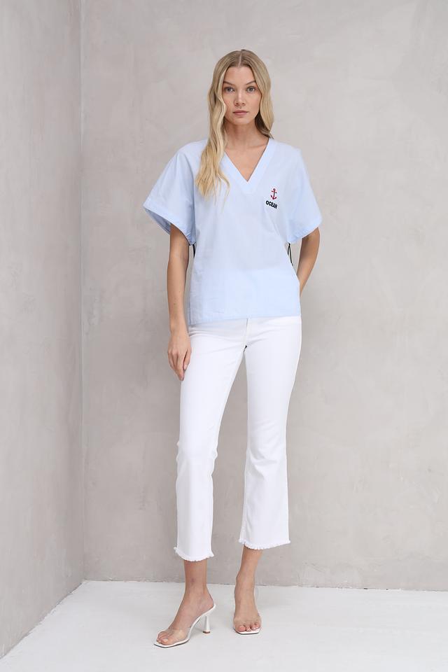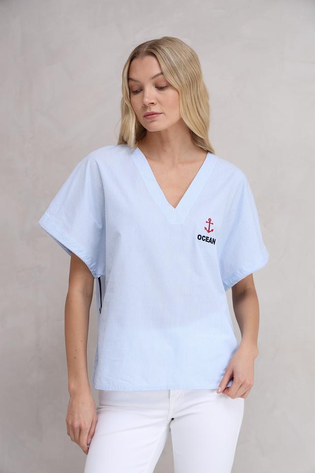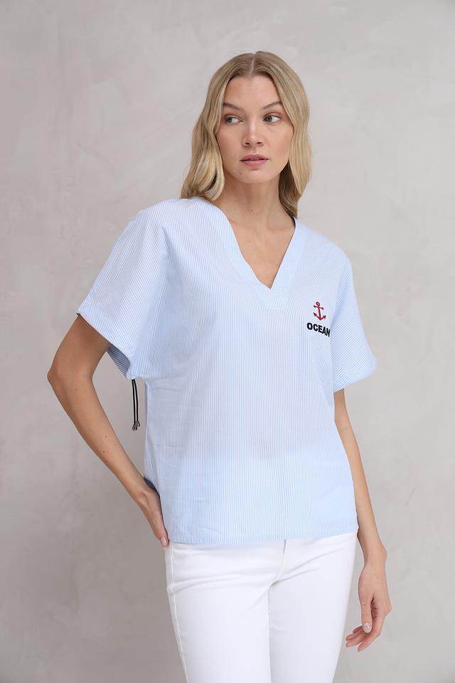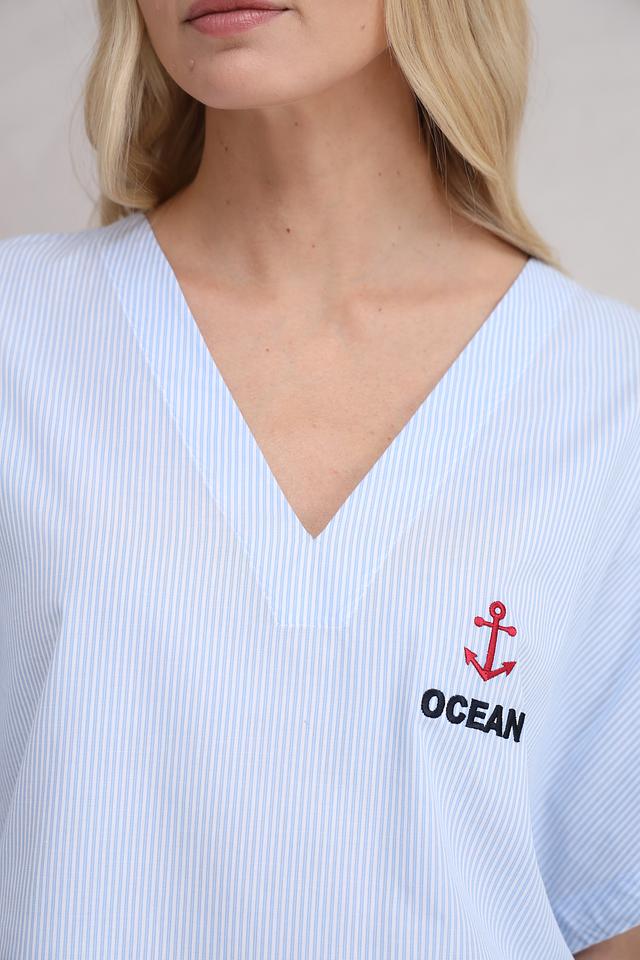 На груди блузы расположена вышивка в морском стиле – якорь и надпись “OCEAN”. Сбоку изделия имеется небольшой разрез. Эта блуза идеально сочетается с джинсами, брюками или юбками, создавая непринужденный и стильный образ.