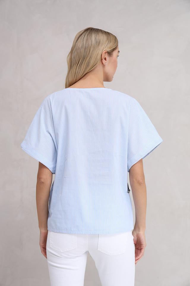 Голубая блуза Margittes в светлую полоску – это стильное и комфортное решение для создания повседневного образа. Модель выполнена из 100% хлопка, имеет V-образный вырез и короткие рукава-фонарики. Состав: хлопок 100%