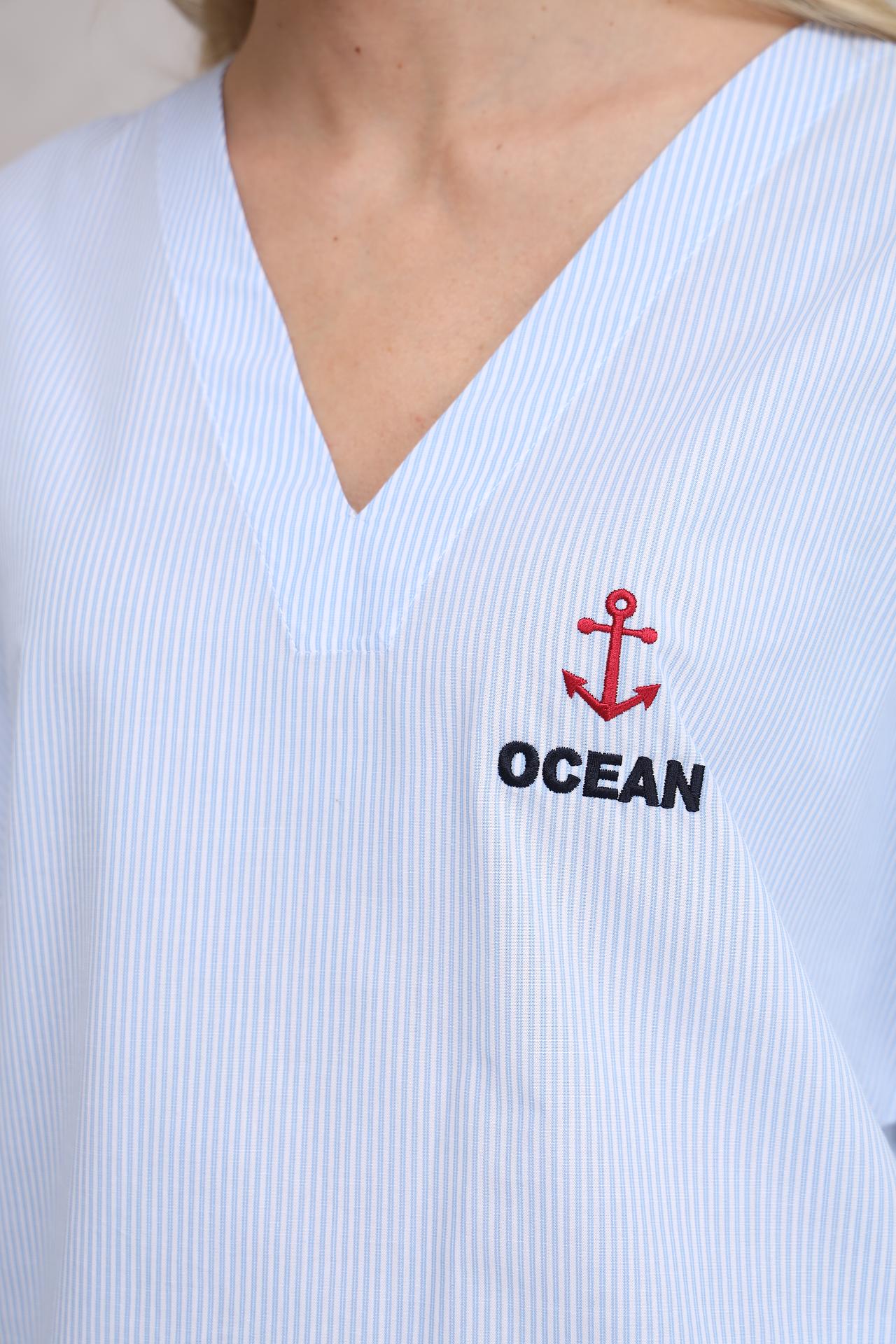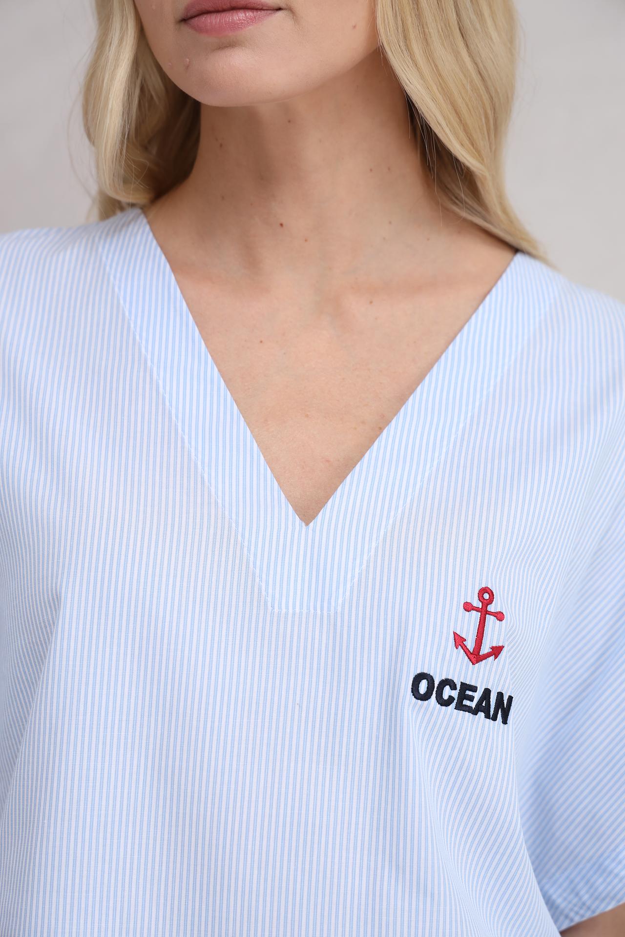 Легкая и стильная блуза от Margittes из 100% хлопка станет незаменимой вещью в вашем гардеробе. Вертикальная полоска визуально стройнит, V-образный вырез горловины подчеркивает линию шеи, а вышивка в морском стиле добавляет образу игривости и непринужденности. Идеальный вариант для создания расслабленных, но элегантных образов.