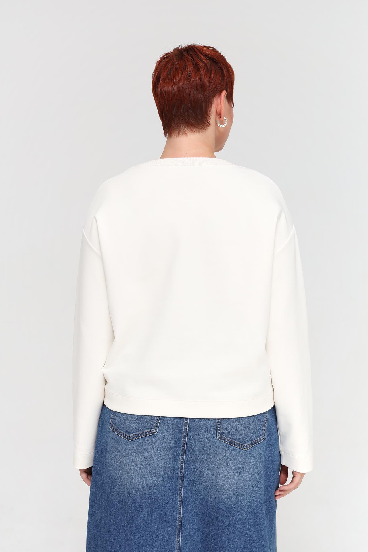 - Универсальный дизайн. Модель свободного кроя с заниженной линией плеча подходит для любого типа фигуры, обеспечивая свободу движений. Классический белый оттенок легко сочетается с различными элементами гардероба, делая пуловер женский базовой вещью.