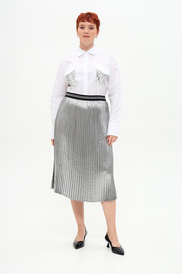 Особенностью модели являются две накладные детали из сверкающих пайеток, расположенные на груди. Они придают рубашке праздничный и нарядный вид, делая ее подходящей для особых случаев.