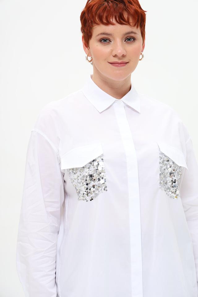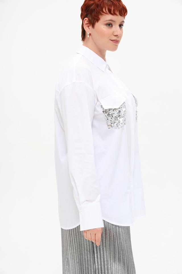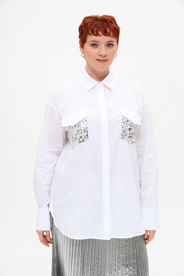 Белая рубашка Margittes с длинным рукавом, украшенная декоративными вставками из пайеток. Стильная модель из хлопка с добавлением эластана обеспечит комфорт и свободу движений. Состав: хлопок 97%, эластан 3%