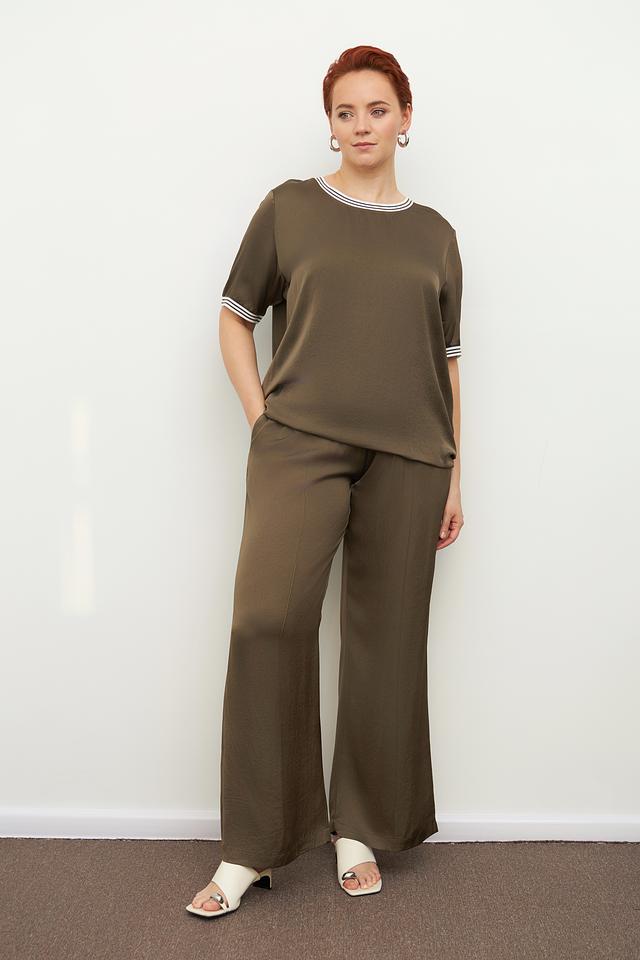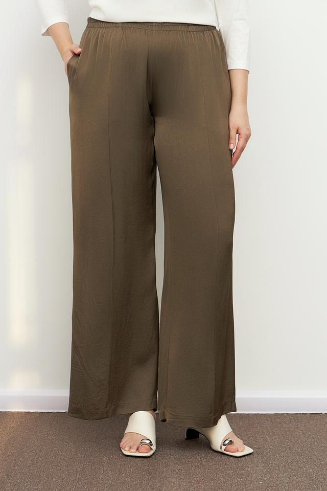 Брюки имеют клёшеный силуэт, который визуально удлиняет ноги и придает образу женственность. Эластичный пояс обеспечивает удобную посадку по фигуре, не стесняя движений.