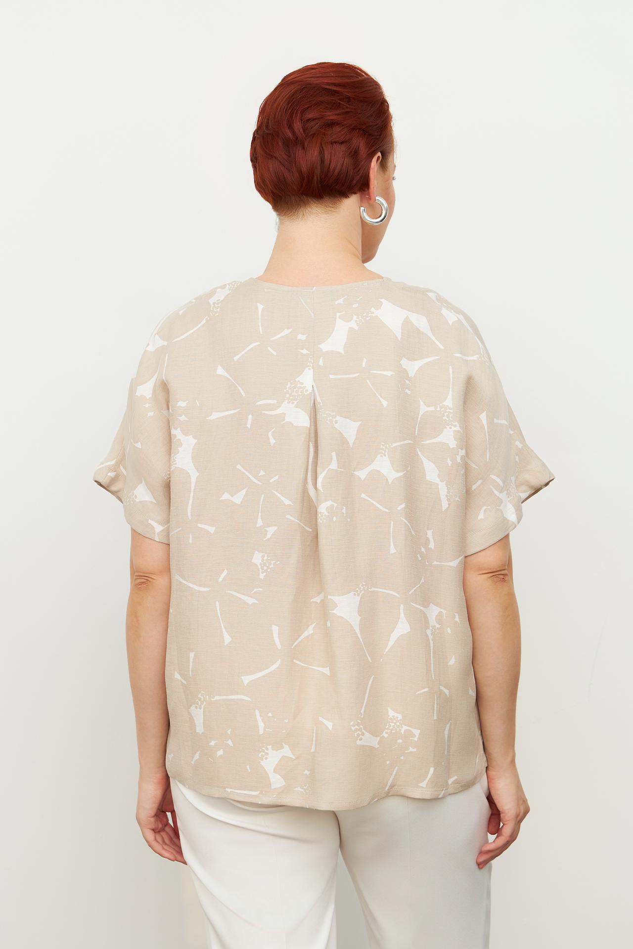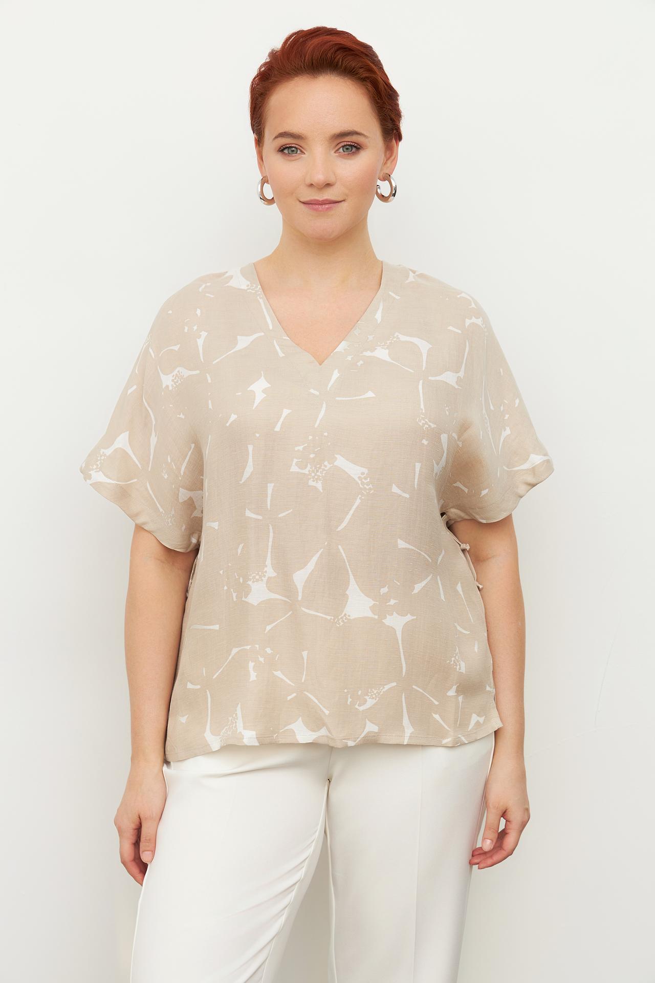 - Стильный дизайн. Бежевая блуза с абстрактным белым принтом выглядит свежо и современно, легко интегрируясь в любой гардероб. V-образный вырез деликатно подчеркивает зону декольте.