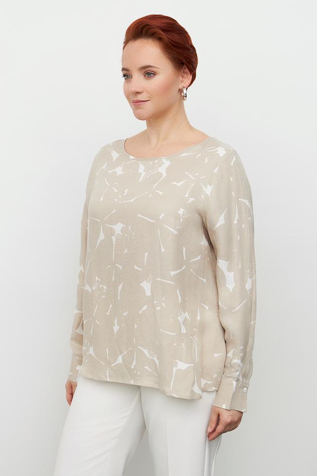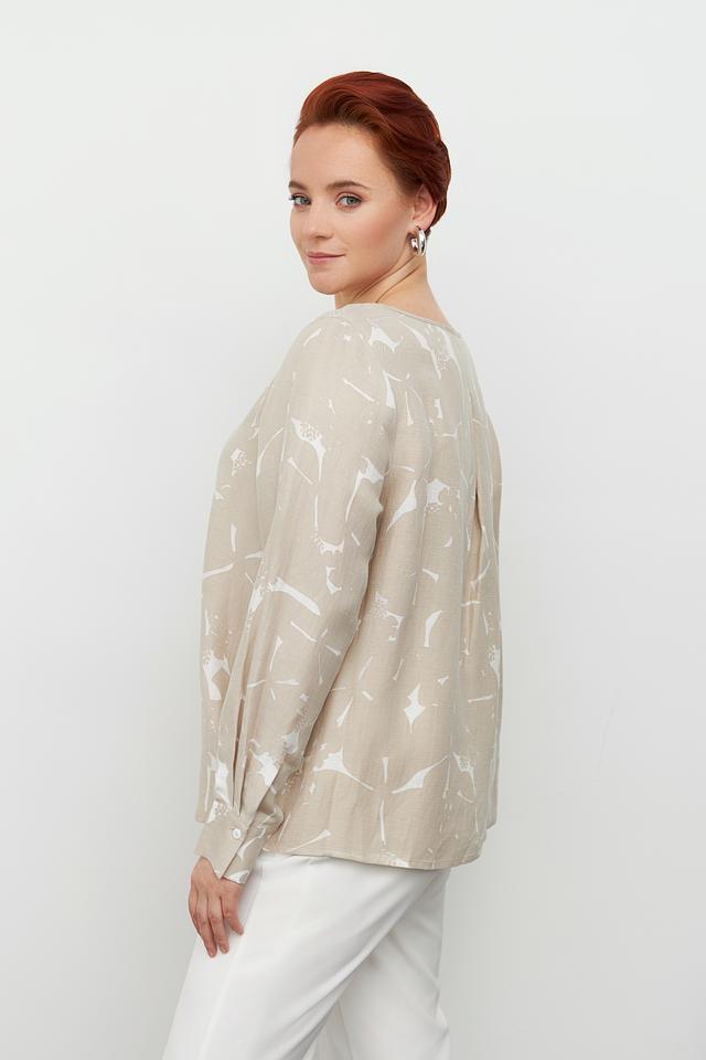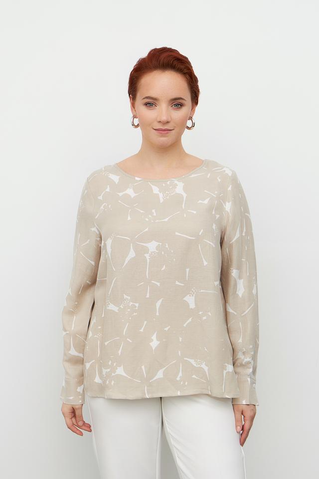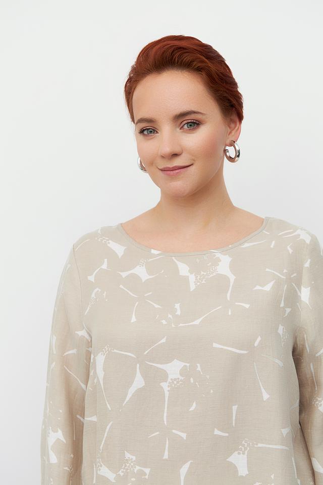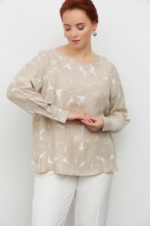 Блуза Margittes бежевого цвета с оригинальным принтом. Изготовлена из льна и купро, обеспечивающих комфорт и воздухопроницаемость. Состав: лен 58%, купро 42%