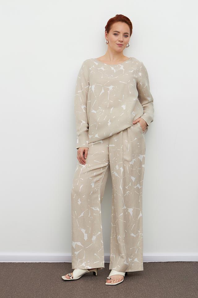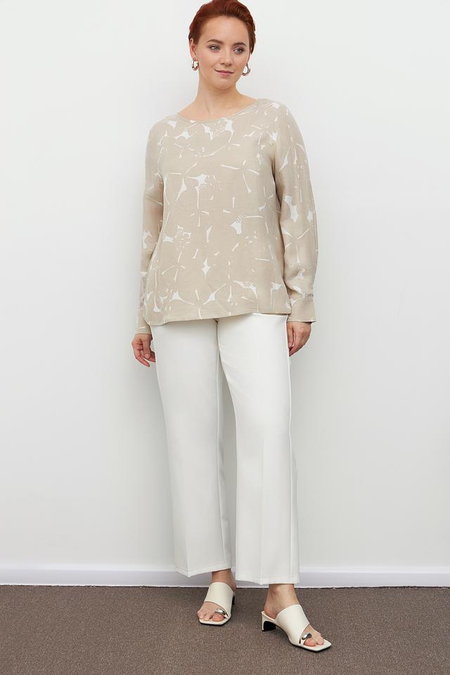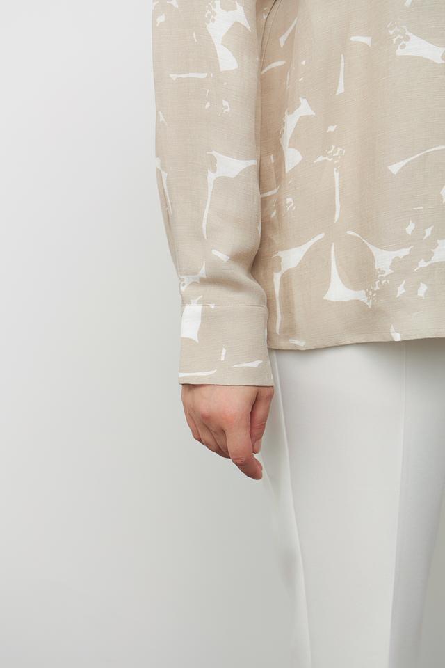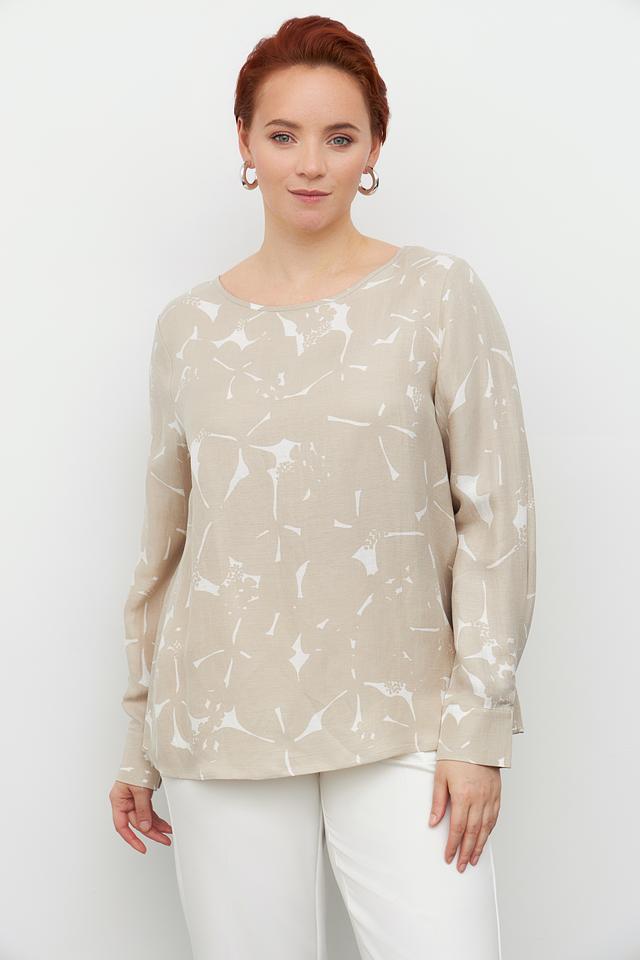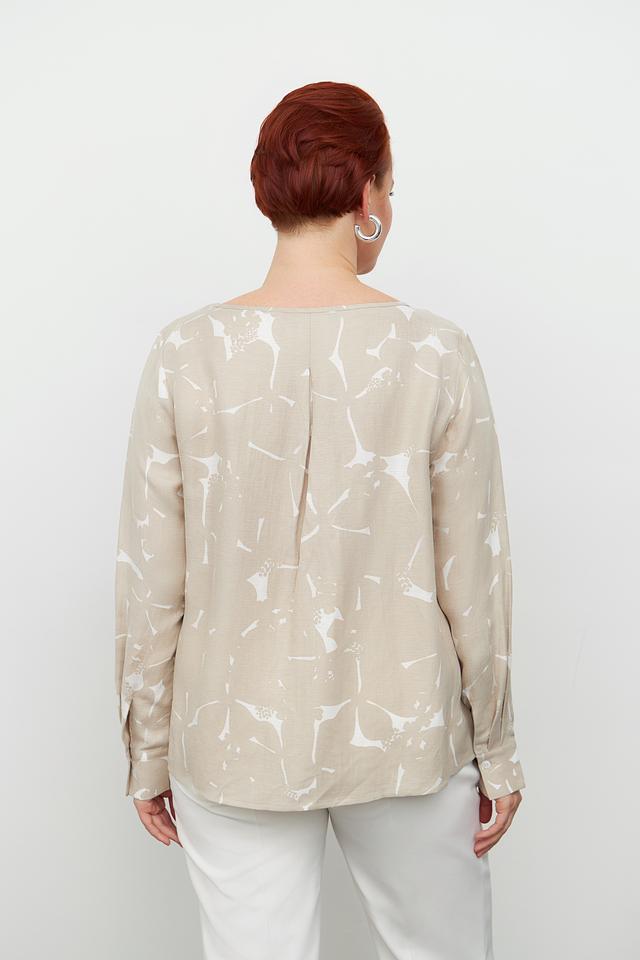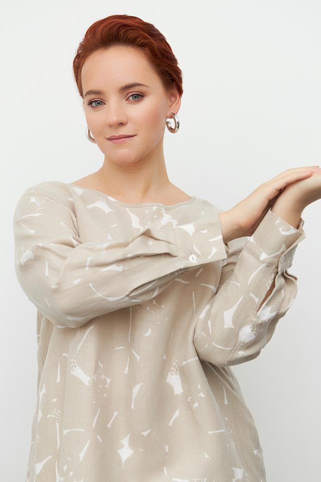 Блуза Margittes бежевого цвета с оригинальным принтом. Изготовлена из льна и купро, обеспечивающих комфорт и воздухопроницаемость. Состав: лен 58%, купро 42%