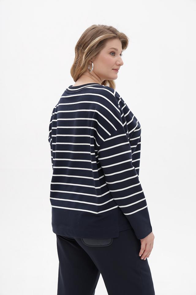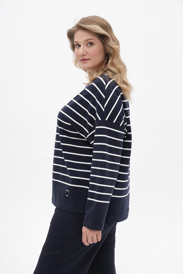 Основной цвет футболки – насыщенный синий, дополненный горизонтальными полосами белого цвета. Такой рисунок визуально освежает образ и подходит практически к любому типу фигуры. На рукаве расположена небольшая декоративная вставка с логотипом бренда.