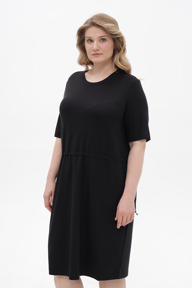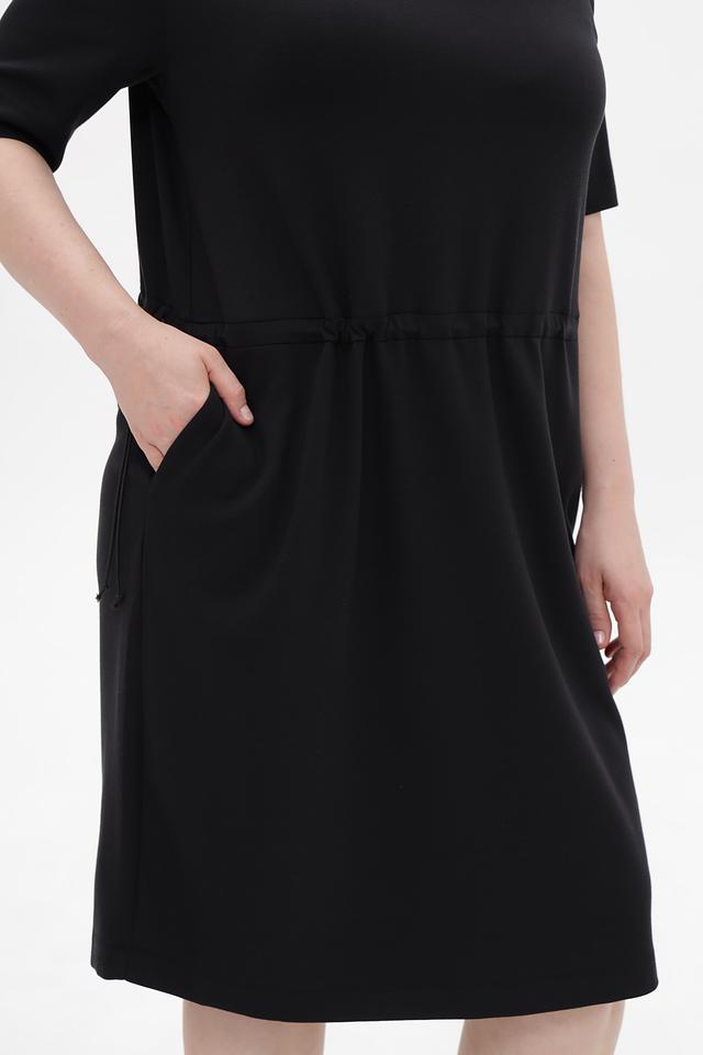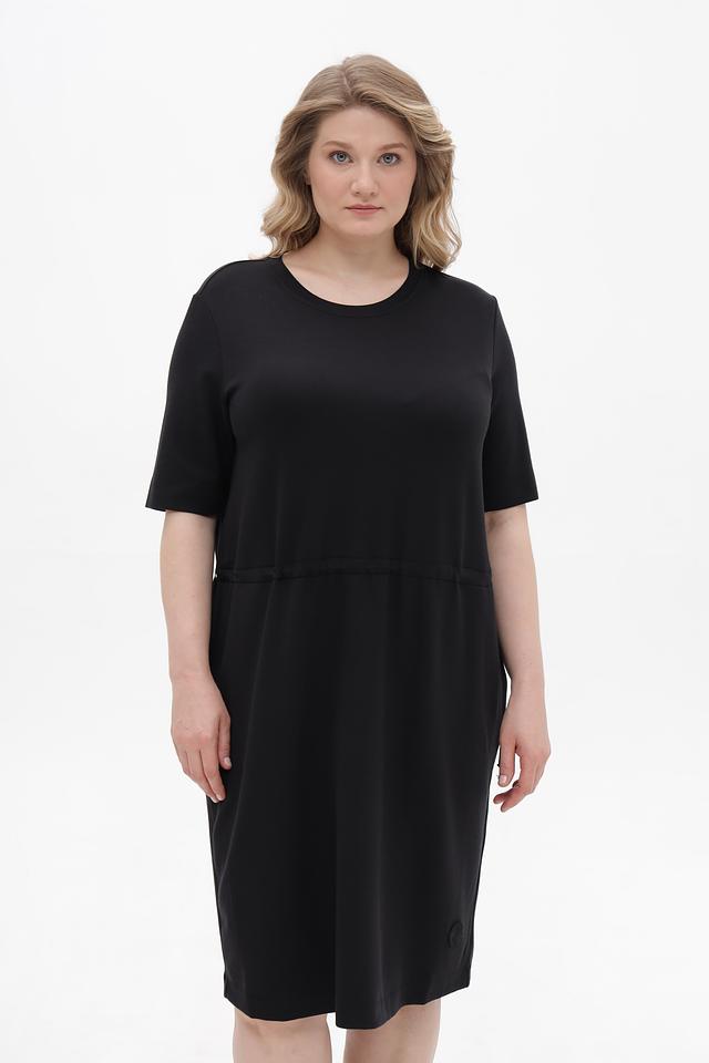 Чёрное платье от Margittes свободного кроя, выполнено из мягкой ткани с добавлением лиоцелла. Модель дополнена удобными боковыми карманами и сборкой по талии с завязками. Состав: лиоцел 78%, эластан 12%, полиамид 10%