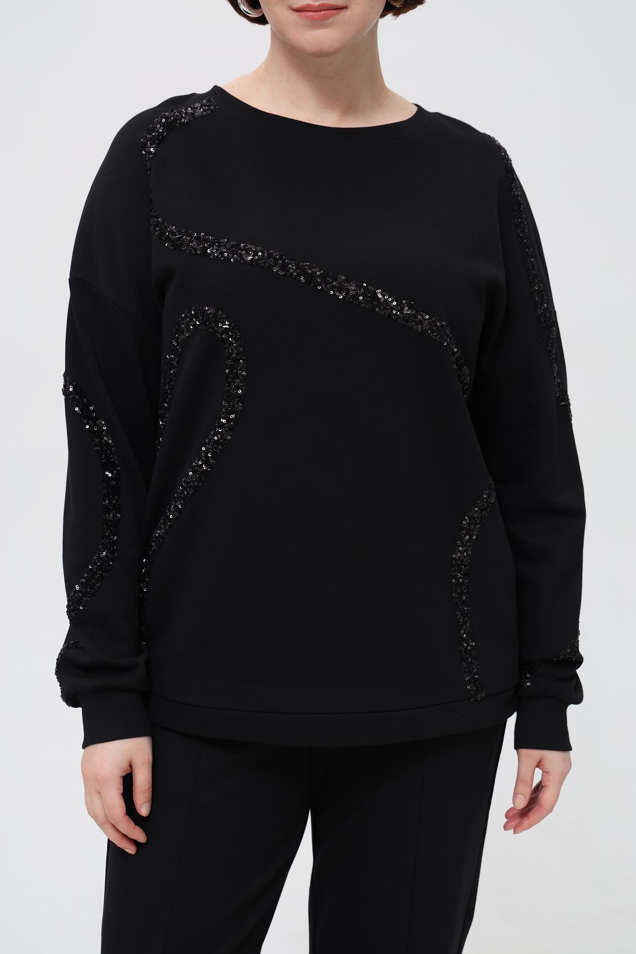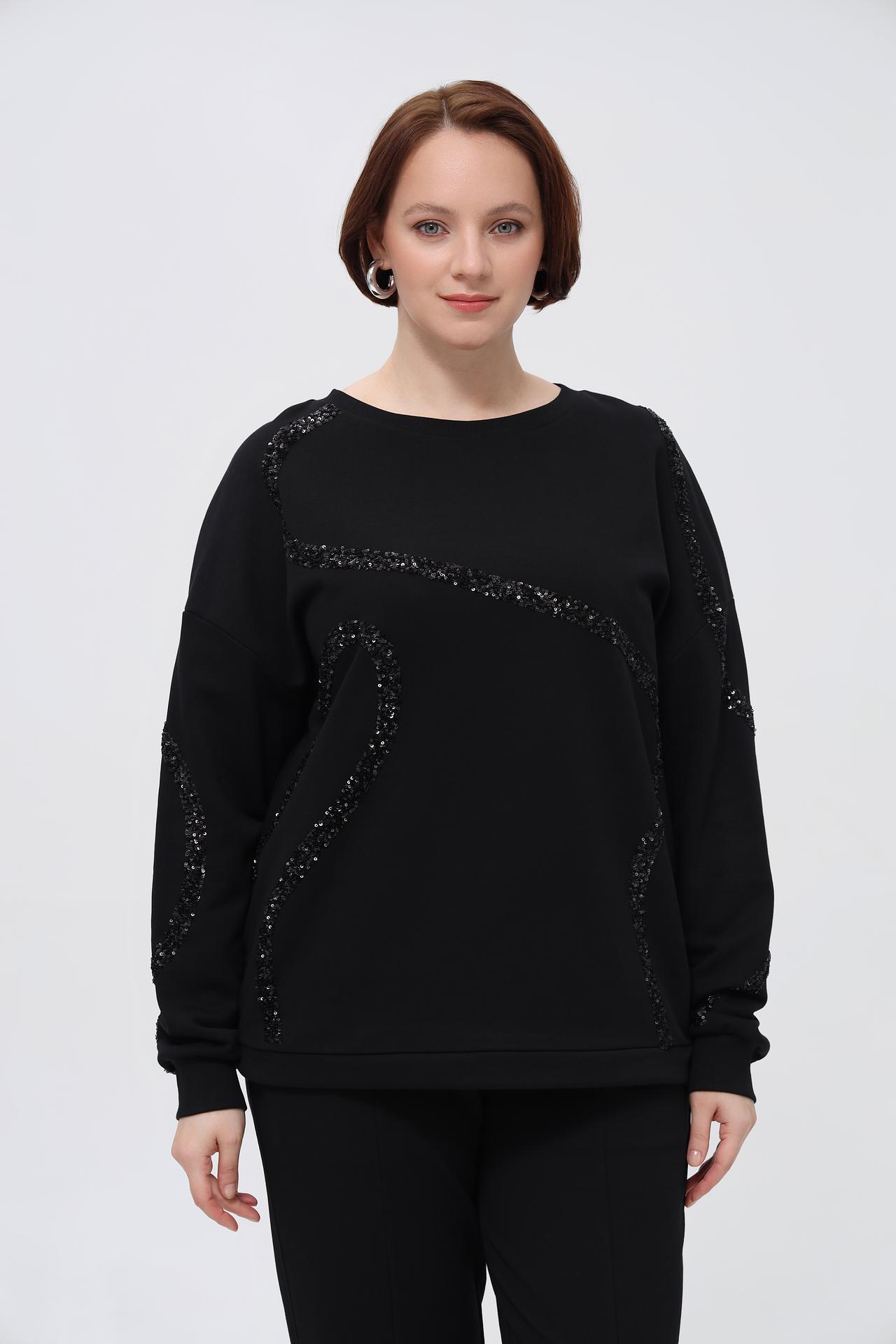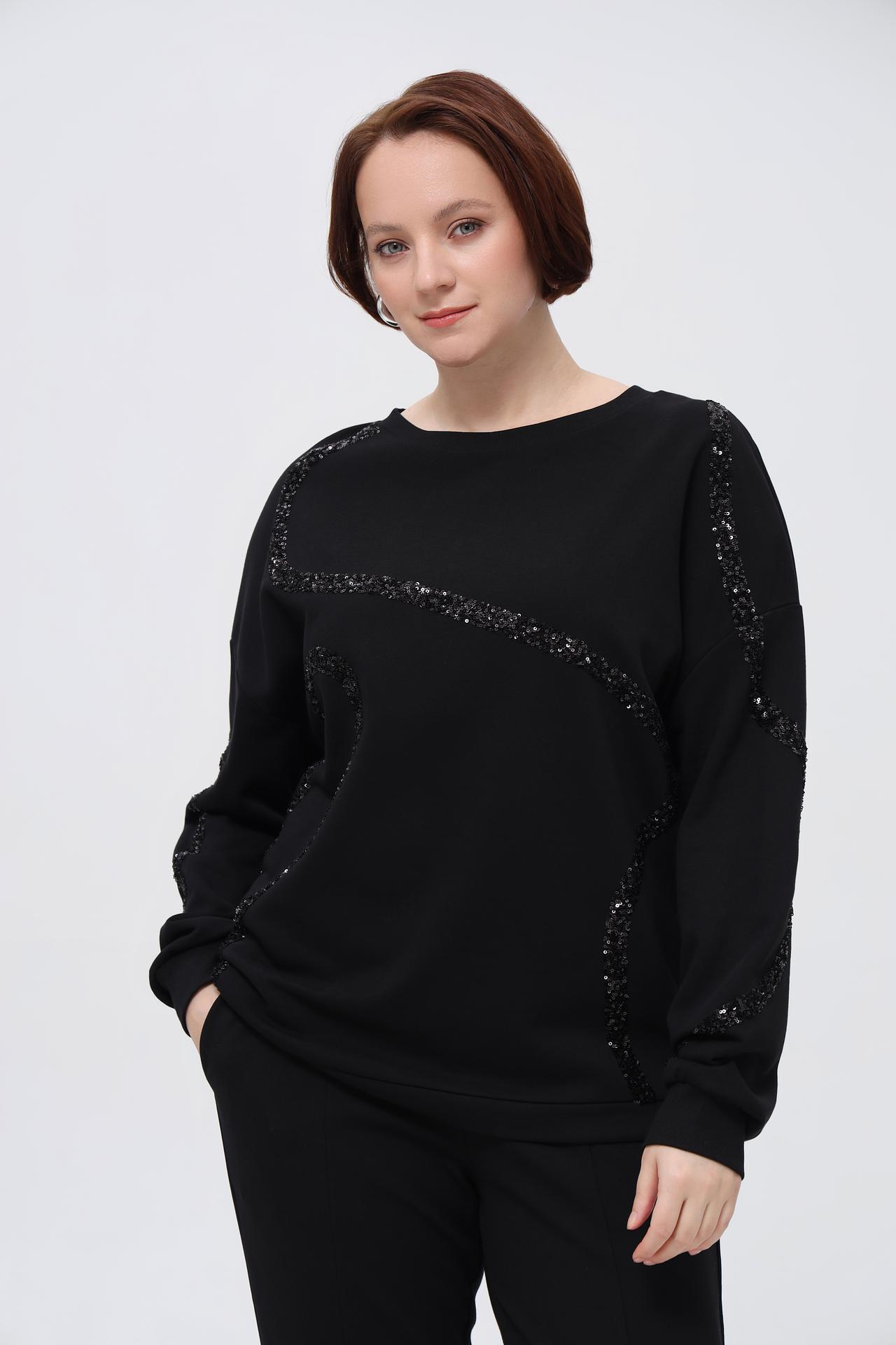 - Дизайн: Черный однотонный пуловер с оригинальным декором из пайеток. Асимметричные линии пайеток создают динамичный и модный вид.