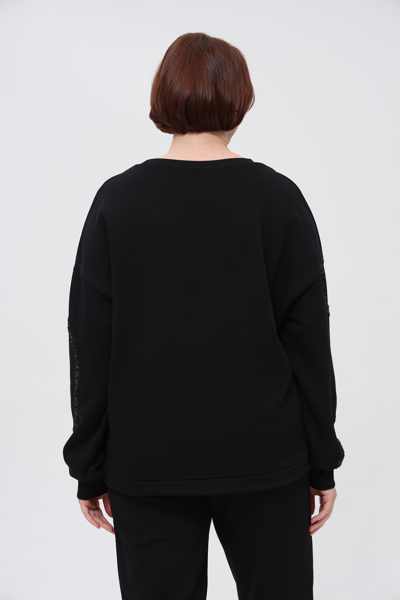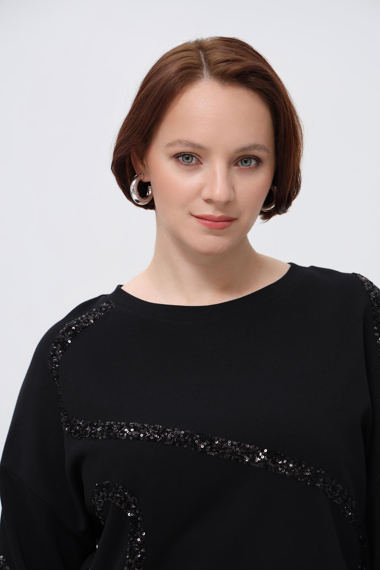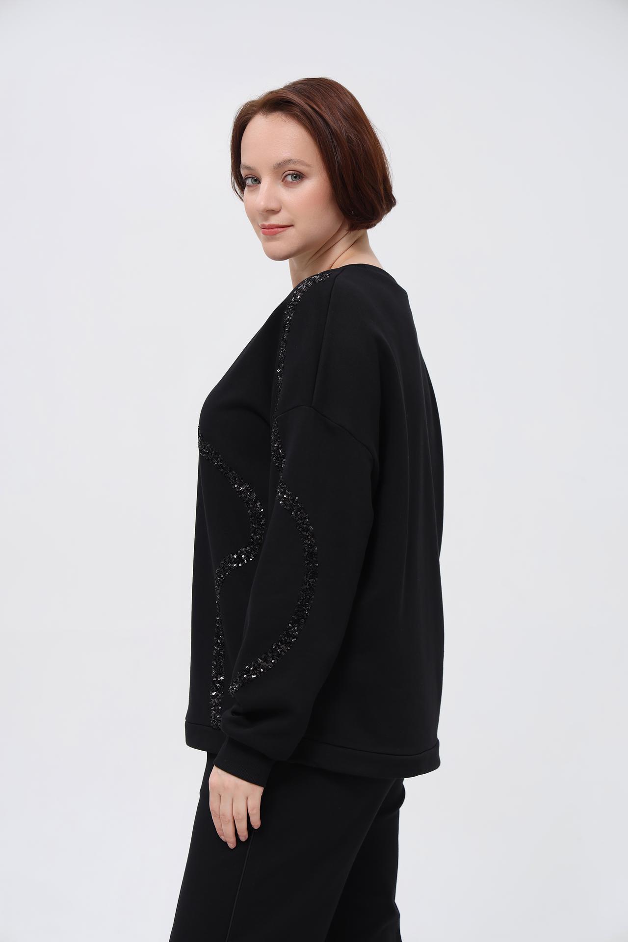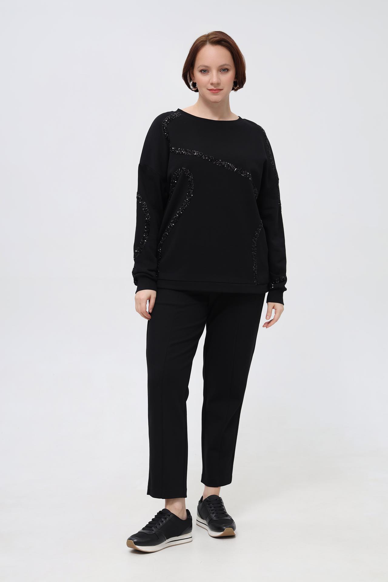 - Дизайн: Черный однотонный пуловер с оригинальным декором из пайеток. Асимметричные линии пайеток создают динамичный и модный вид.
