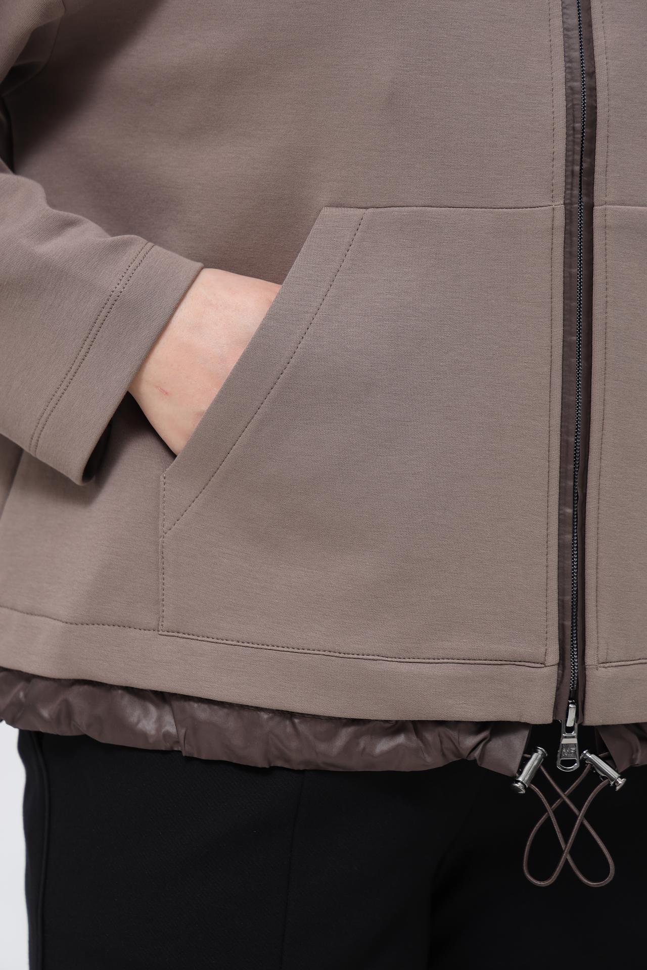 Особое внимание уделено деталям: удобная застежка-молния, глубокий капюшон с регулируемым шнурком и функциональные накладные карманы обеспечивают дополнительный комфорт и практичность. Низ изделия оформлен контрастной отделкой, добавляющей жакету оригинальности.
