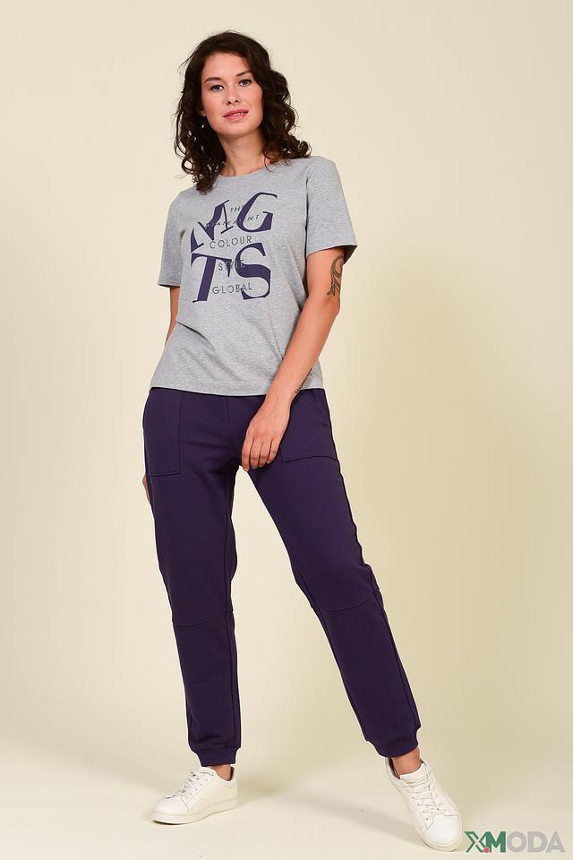 Футболка имеет прямой крой и короткие рукава. Главная особенность модели – яркий принт с надписями и графическими элементами в фиолетовом цвете, который добавляет образу индивидуальности.