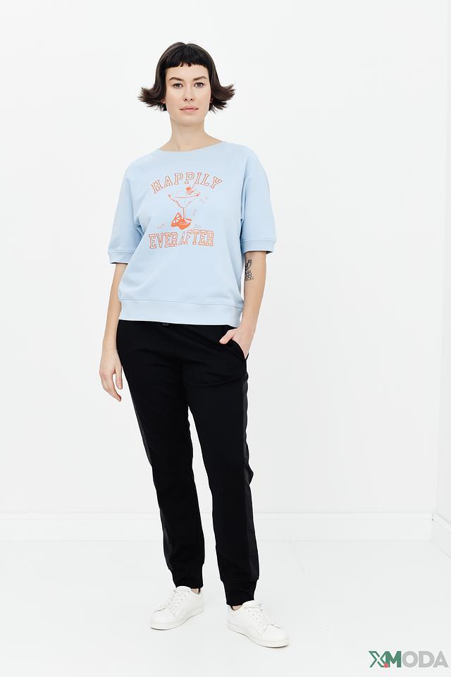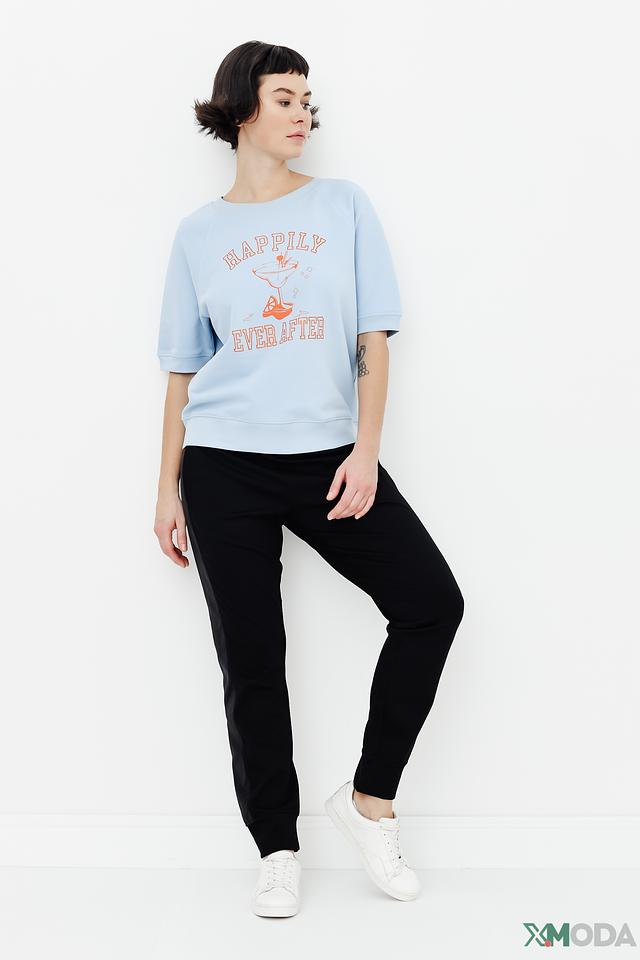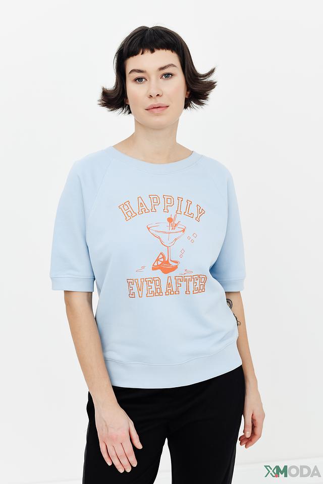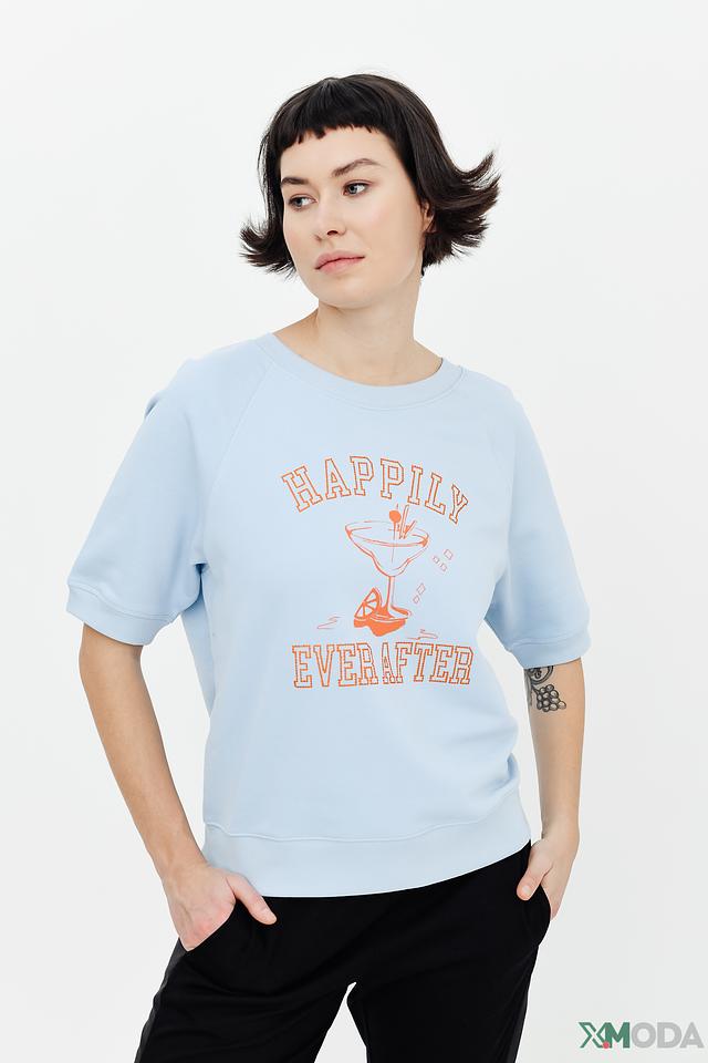 Голубой пуловер от Margittes с коротким рукавом и ярким принтом "Happily Ever After". Изготовлен из мягкого хлопка с добавлением полиэстера для комфорта и долговечности. Стильный и удобный выбор для повседневного образа. Состав: хлопок 83%, полиэстер 17%