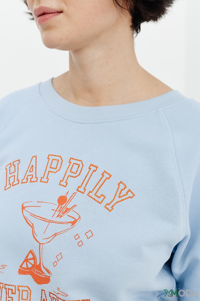 Этот пуловер от Margittes станет отличным дополнением к вашему гардеробу. Он выполнен в нежном голубом цвете и украшен оригинальным принтом с надписью "Happily Ever After" и изображением коктейльного бокала.