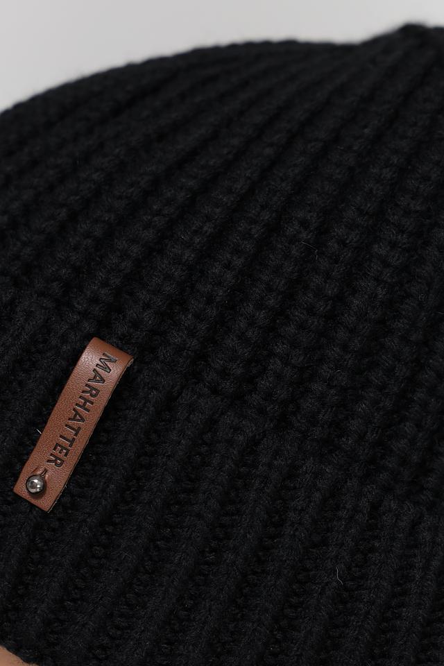 Вязаная текстура шапки придает ей стильный и современный вид. На боковой части шапки расположена небольшая кожаная бирка с логотипом Marhatter, что подчеркивает ее принадлежность к бренду. Шапка плотно прилегает к голове, защищая от ветра и холода.