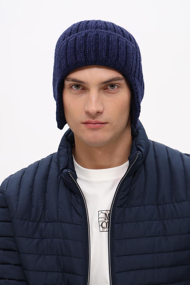 Шапка выполнена в насыщенном синем цвете и имеет классический дизайн с отворотами. Вязаная текстура придает шапке уютный вид. Сбоку шапки расположен небольшой металлический логотип бренда, который добавляет узнаваемости.
