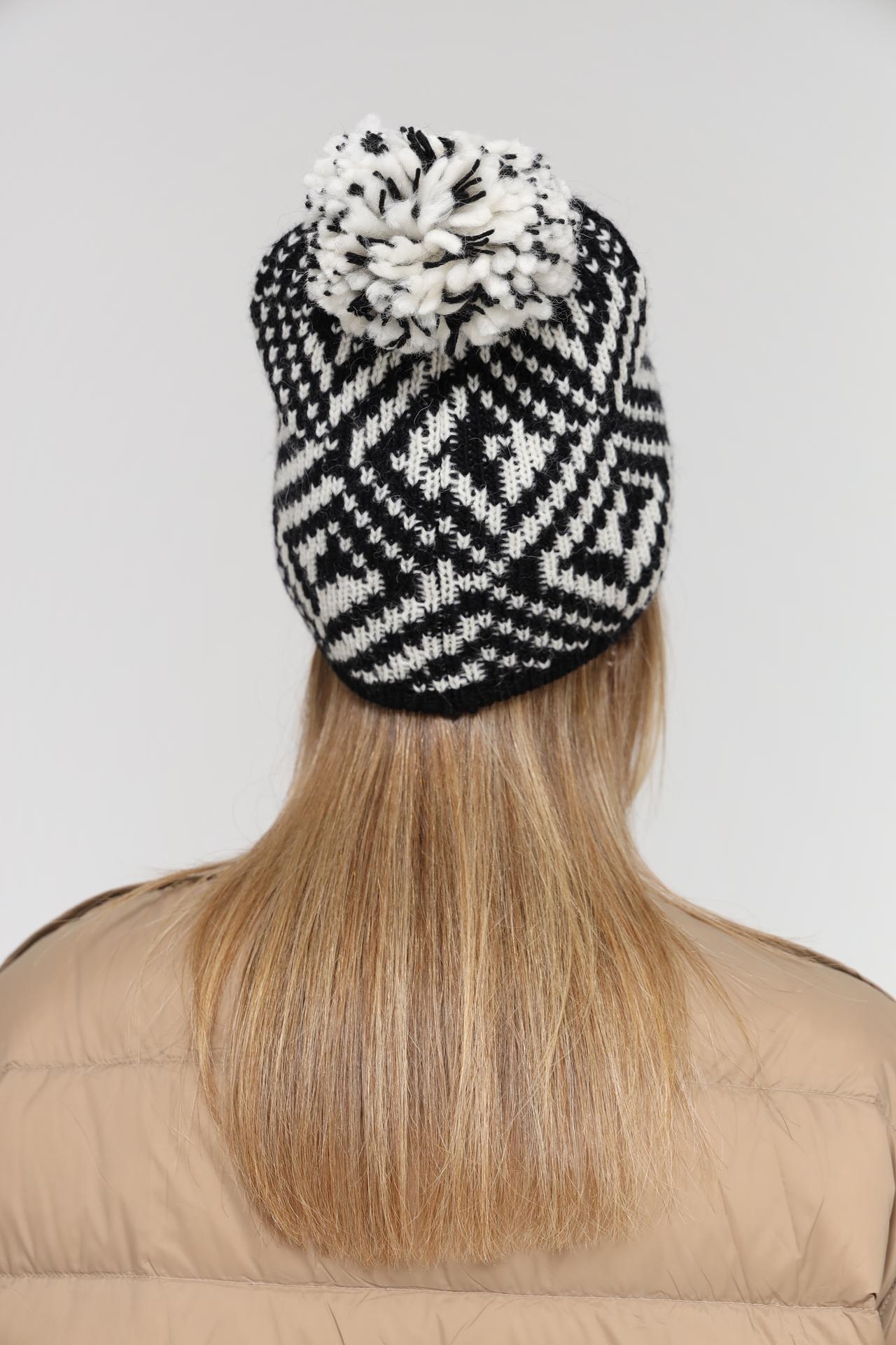 - Дизайн: Шапка украшена контрастным геометрическим принтом, который выглядит эффектно и модно. Верх дополнен объемным помпоном, придающим изделию особое очарование.