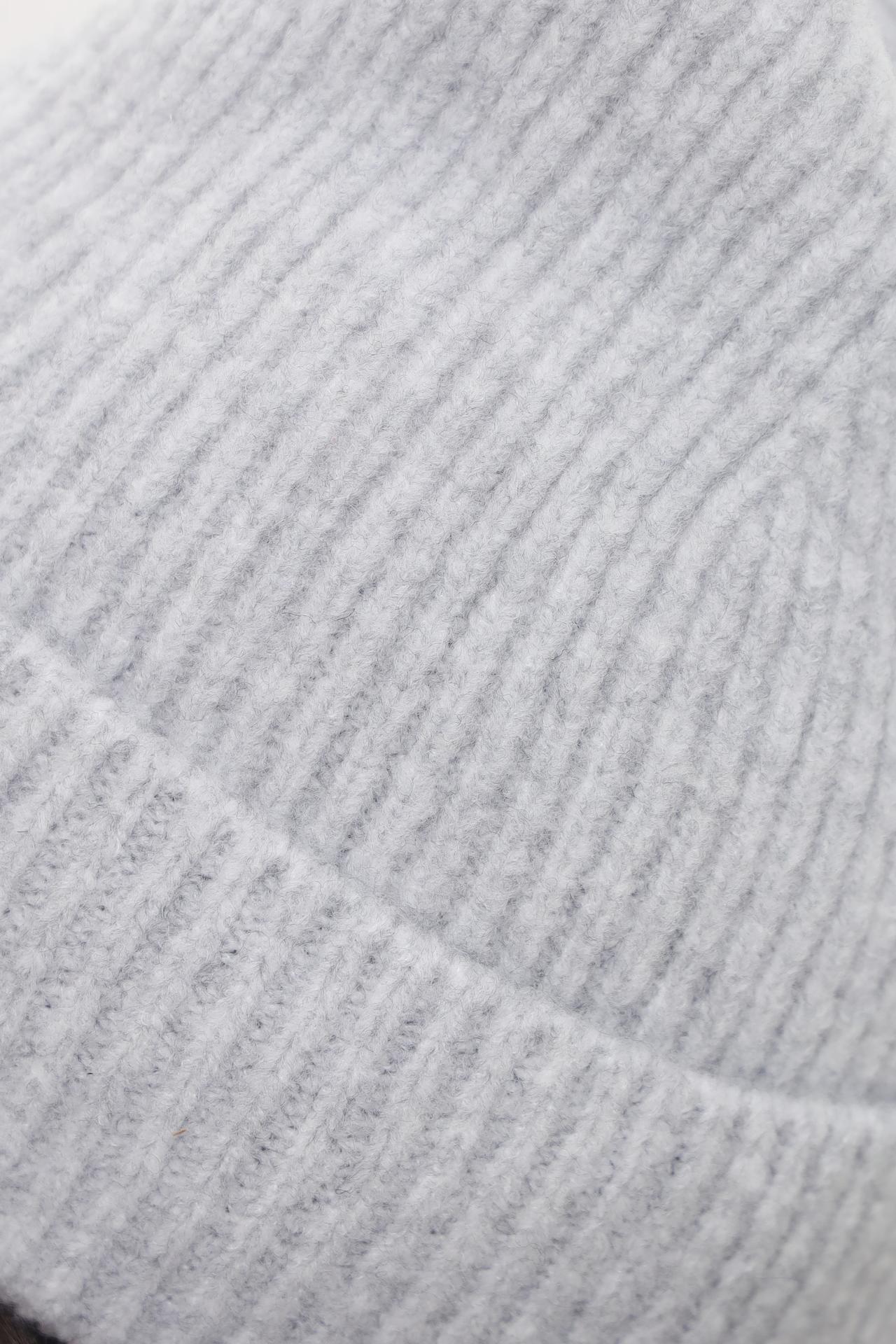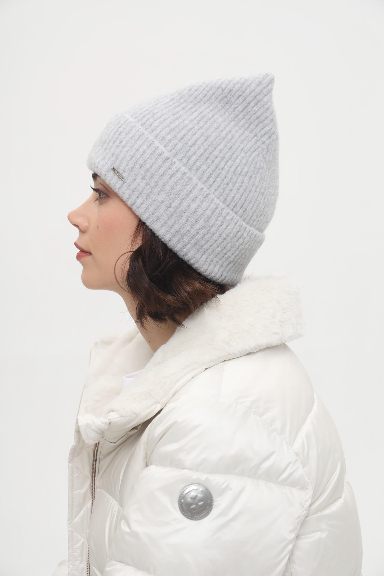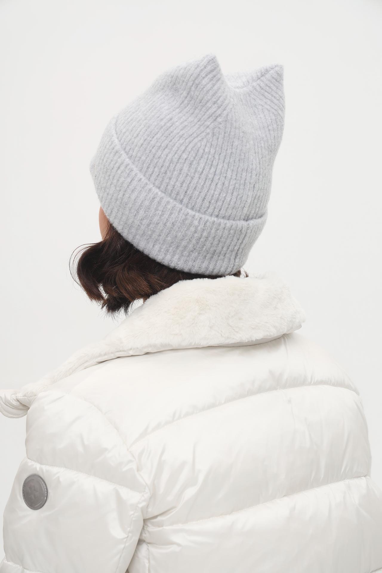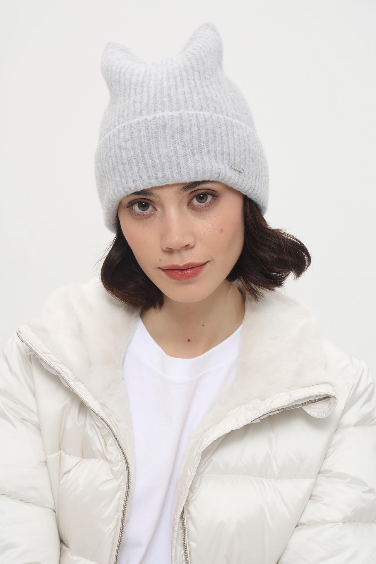 - Дизайн: Классическая вязаная шапка с оригинальными ушками, придающими образу индивидуальность. Текстура в мелкую резинку выглядит элегантно и минималистично.