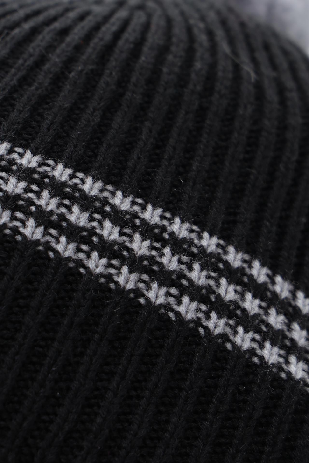 - Дизайн: Классическая модель с декоративными полосами и помпоном. Элегантный чёрный цвет и ненавязчивые серые узоры делают шапку универсальной для любого гардероба.