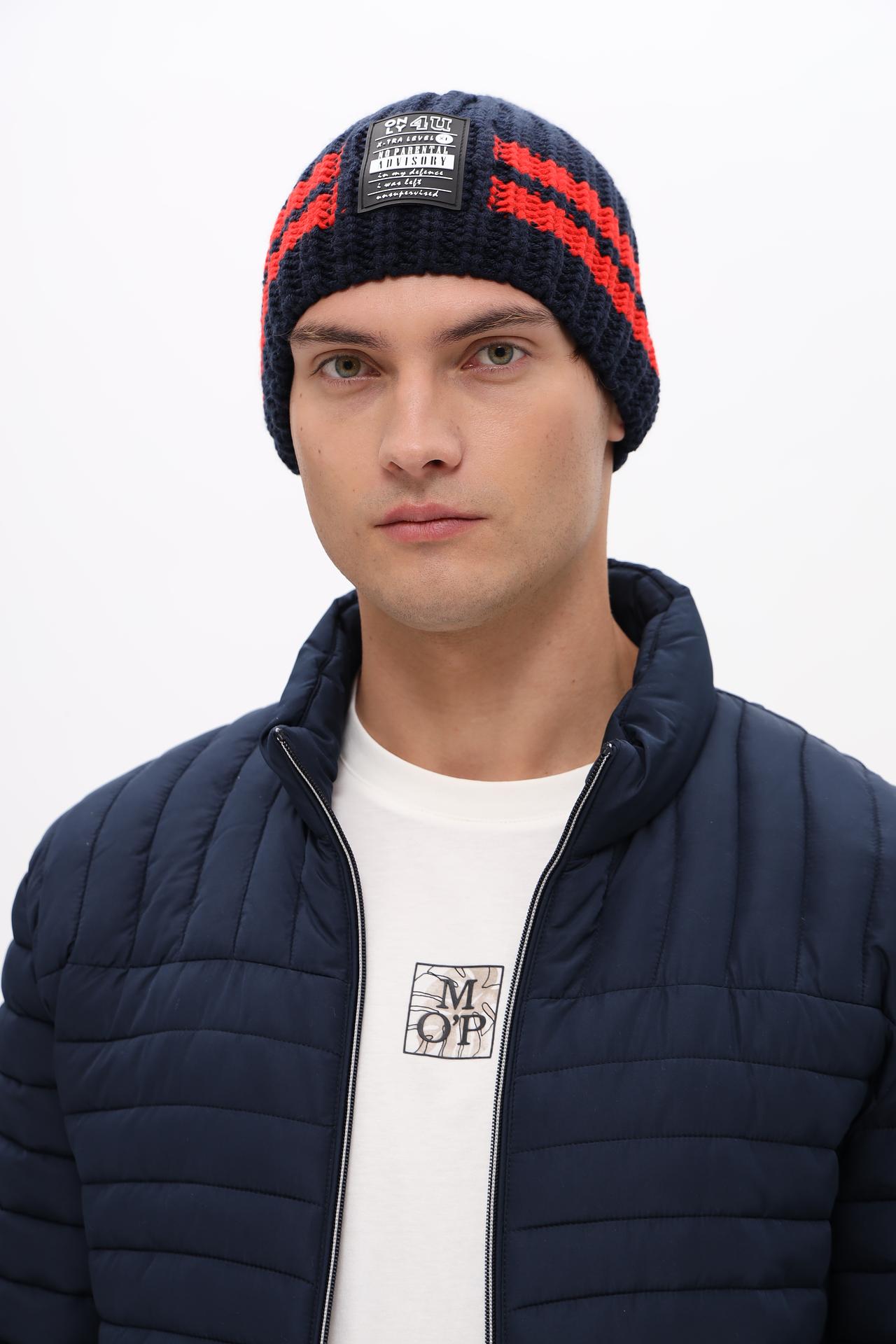 Шапка Marhatter тёмно-синяя с красными полосками и нашивкой