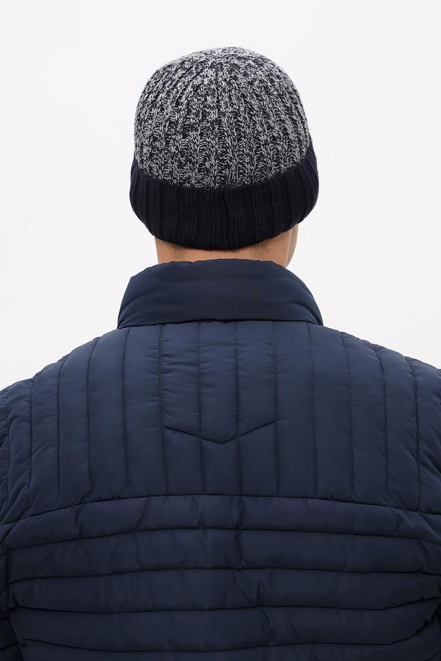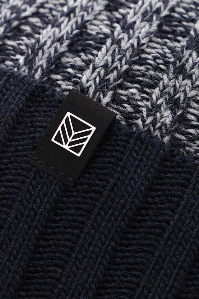 Основной цвет шапки – тёмно-синий, который гармонично сочетается с меланжевой вязкой верхней части. Такое сочетание делает шапку универсальной и подходящей к различным стилям одежды. Небольшой логотип бренда, расположенный спереди, добавляет шапке узнаваемости и подчеркивает её принадлежность к известному производителю.