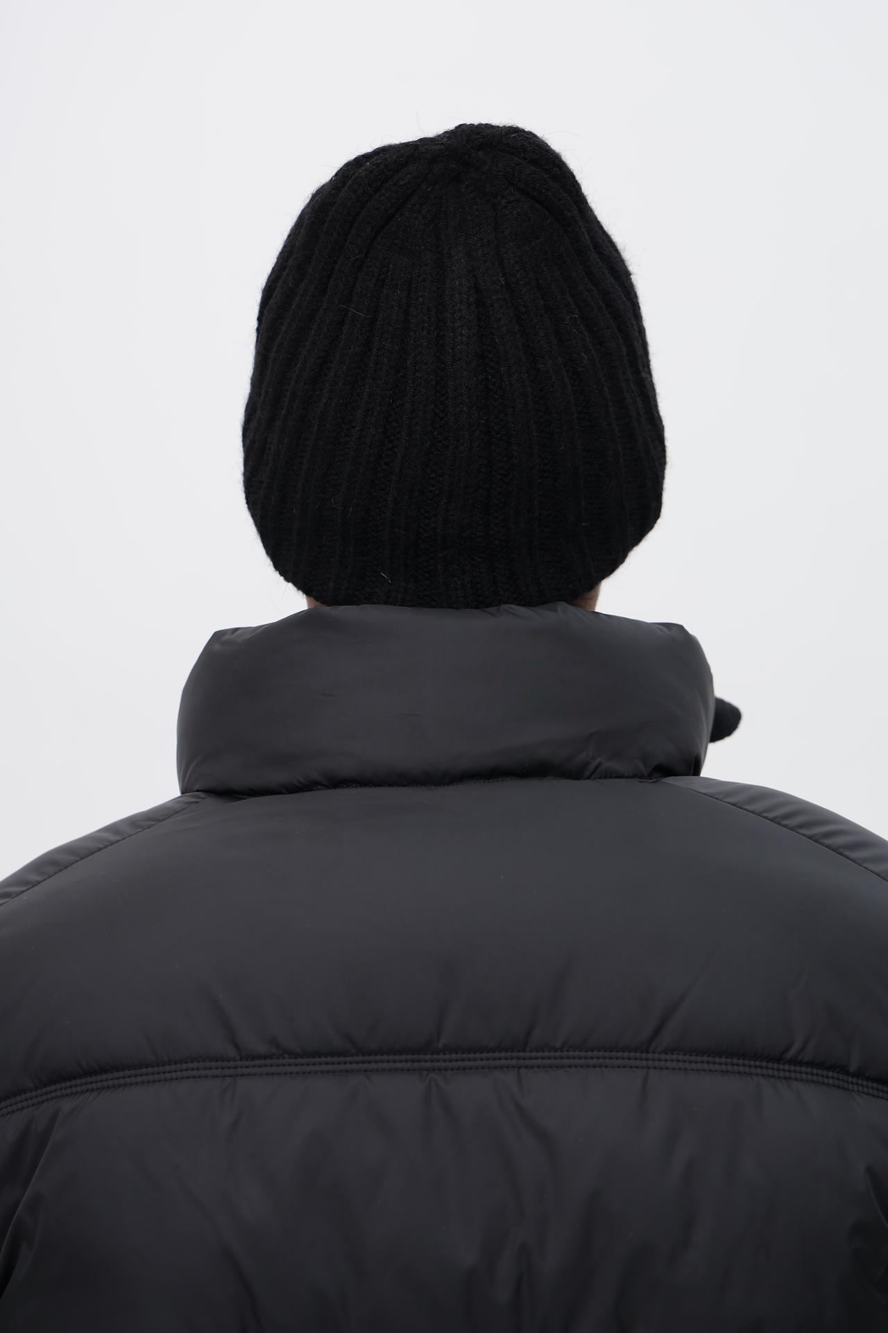 - Внешний вид: Элегантный черный цвет и фактурная вязка в рубчик создают стильный и современный образ. Металлический шильдик бренда добавляет шапке изюминку.