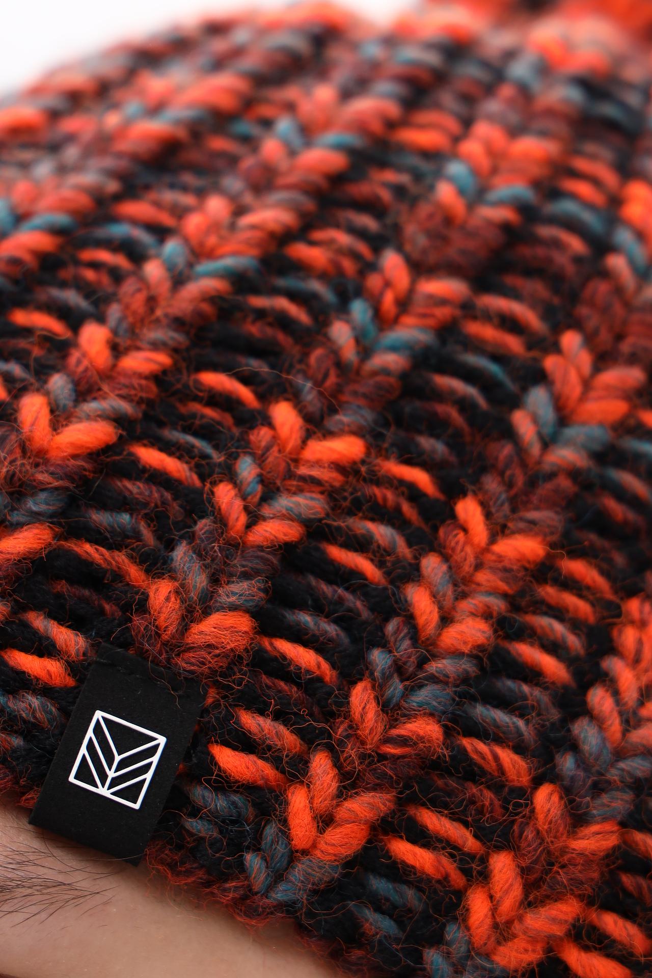 - Яркий дизайн. Модель отличается оригинальным меланжевым переплетением нитей черного, оранжевого и серого оттенков, что делает ее ярким акцентом в любом образе. Классическая форма бини с аккуратным помпоном придает шапке завершенный вид.