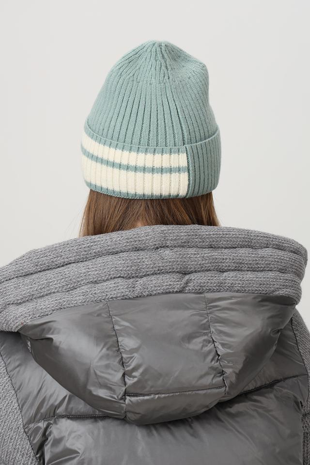 Шапка выполнена из мягкого трикотажа, который обеспечивает тепло и уют. Дизайн дополнен контрастными белыми и бежевыми полосками, создающими эффектный визуальный акцент.