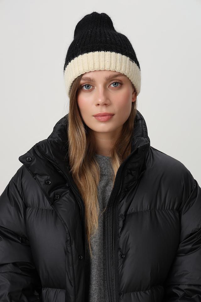 Классическая вязаная шапка от Marhatter, выполненная в сочетании двух цветов и фактур. Верхняя часть шапки выполнена из объёмной пряжи чёрного цвета, создающей эффект лёгкой небрежности. Нижняя часть – широкий вязаный отворот кремового оттенка, добавляющий образу мягкости и уюта.