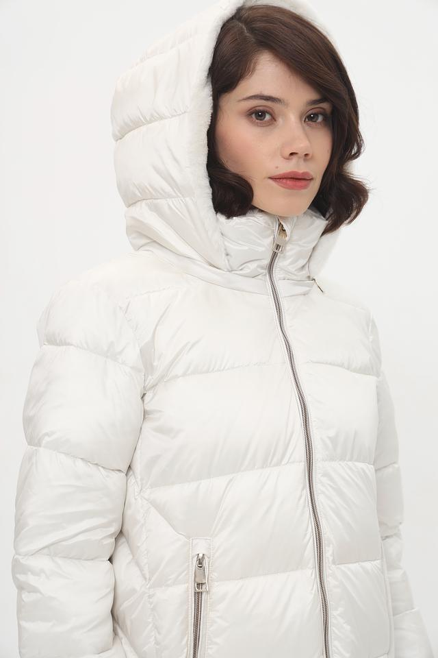 Бежевое стеганое пальто Milestone из полиамида и полиэстера. Удлиненный силуэт с капюшоном и застежкой-молнией. Идеально для прохладной погоды. Состав: полиамид 52%, полиэстер 48%