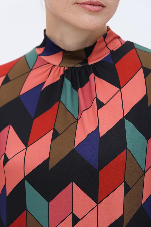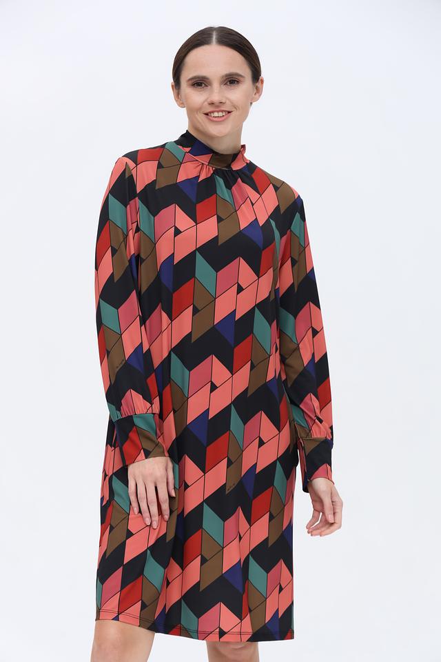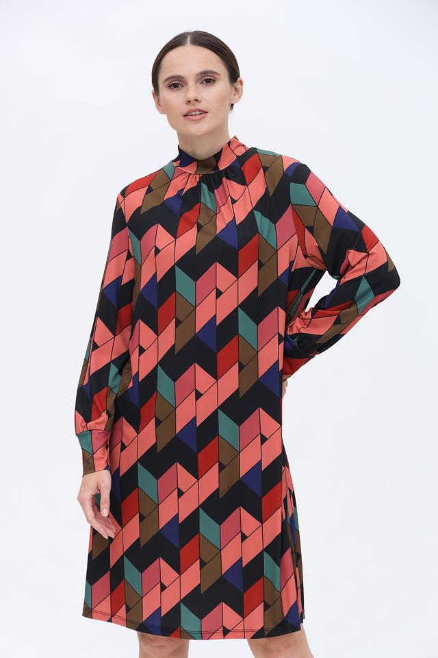 Платье имеет прямой силуэт и длину до колена. Отличительной особенностью является яркий геометрический принт, выполненный в сочетании нескольких цветов: чёрного, красного, коричневого, зелёного и синего. Высокий воротник-стойка и длинные рукава добавляют образу изысканности.