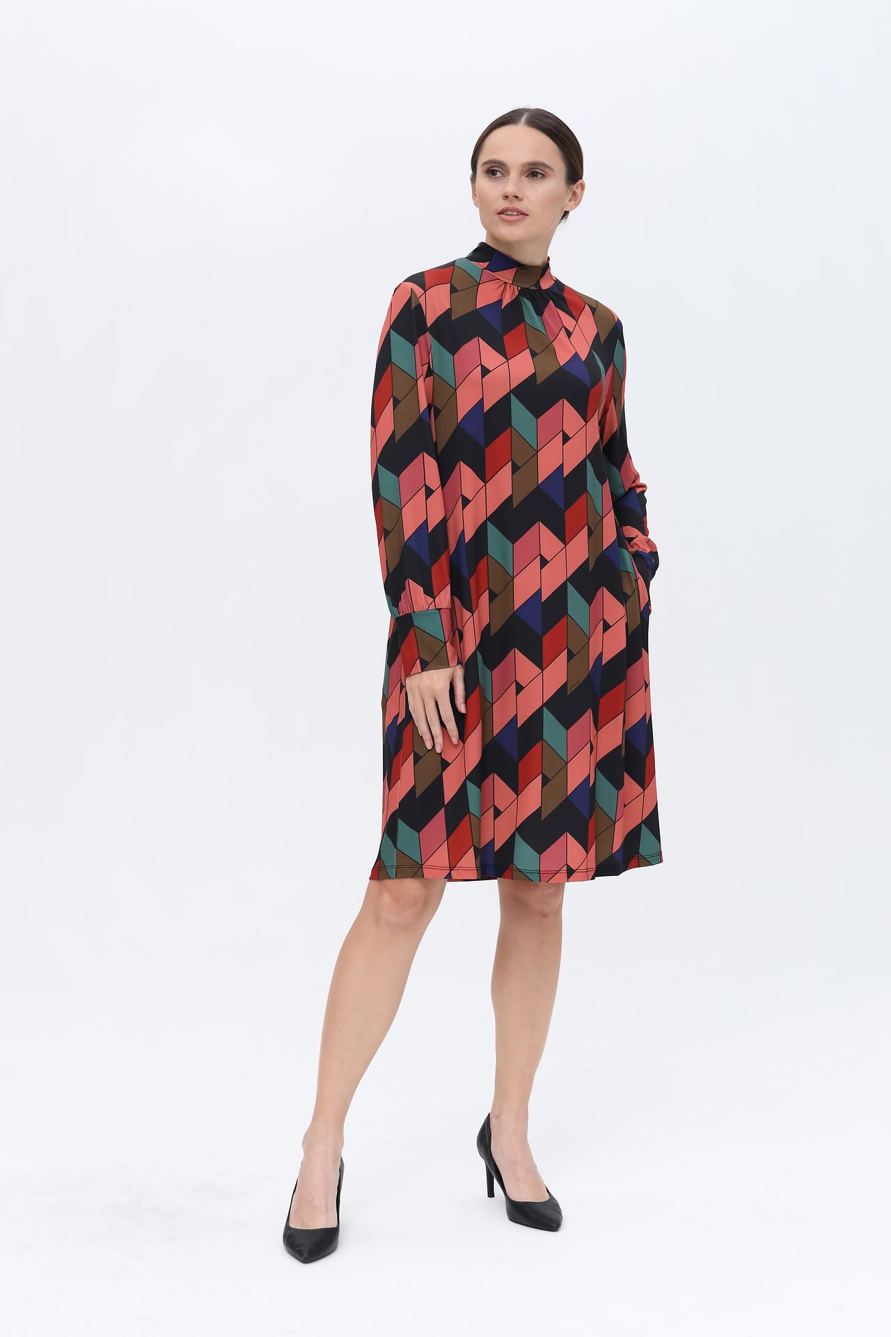 Элегантное платье Miss Lagotte, выполненное в стиле арт-деко, станет изысканным дополнением к вашему гардеробу. Геометрический принт с сочетанием коралловых, синих, зеленых и коричневых оттенков на черном фоне создает эффектный и запоминающийся образ.