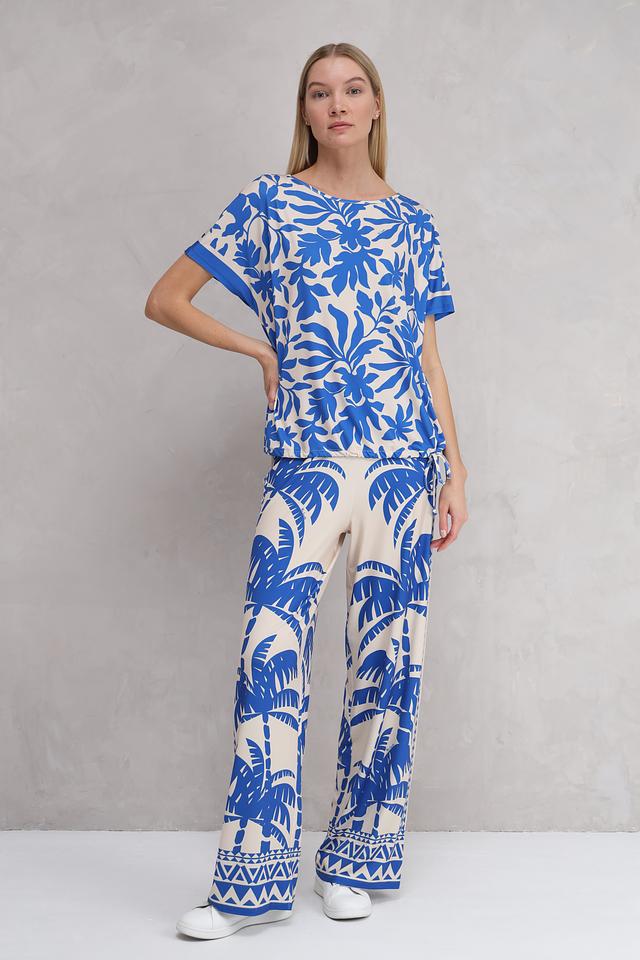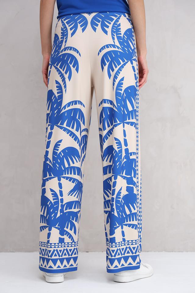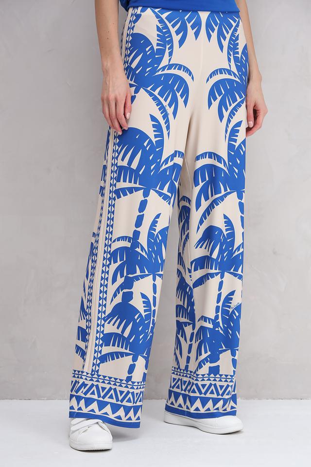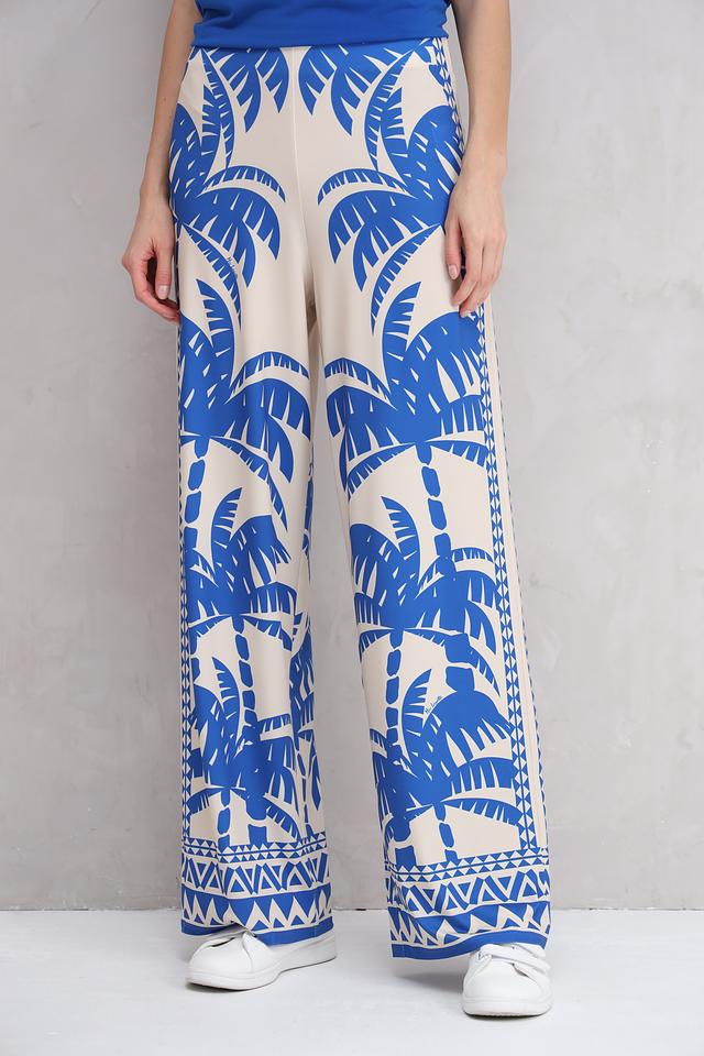 Брюки отличаются широким кроем и длиной до пола, что делает их актуальными и стильными. Основной цвет брюк – кремовый, а яркий синий принт с изображением пальмовых листьев добавляет образу тропическое настроение.