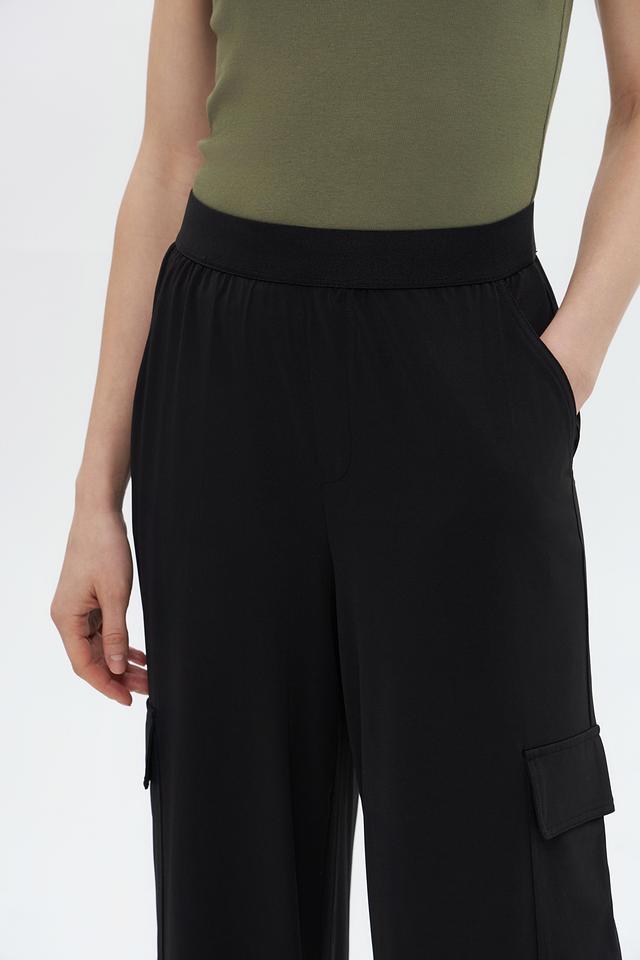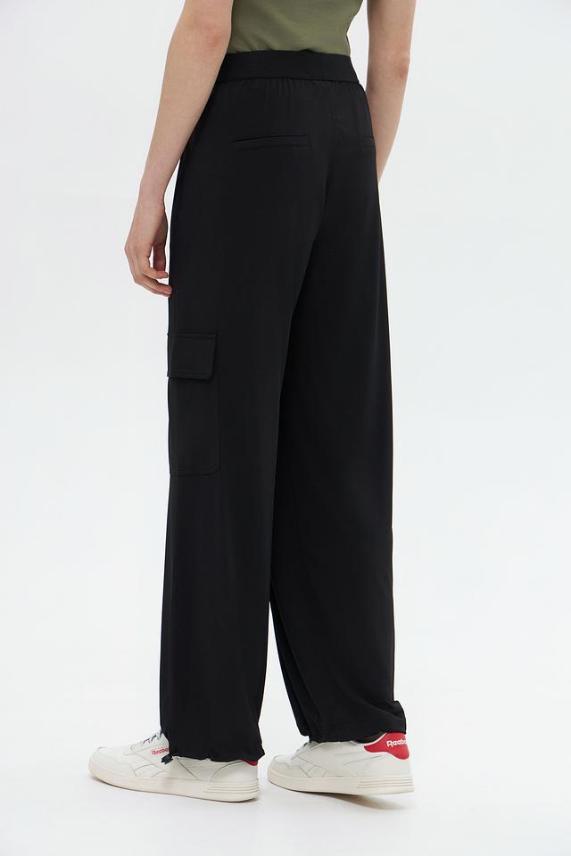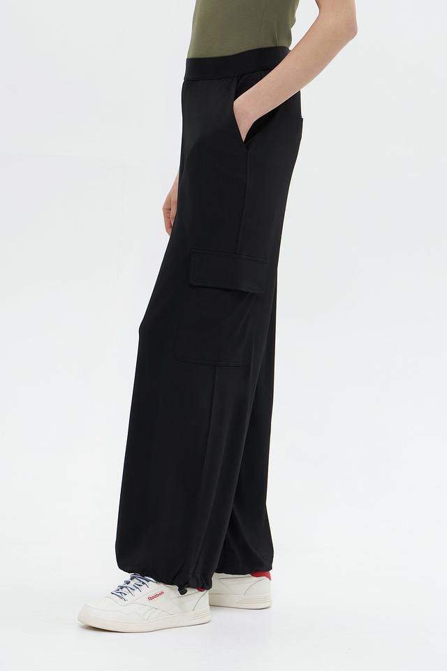 Чёрные брюки карго от Miss Lagotte — стильная и удобная модель с эластичным поясом и боковыми карманами. Изготовлены из полиэстера с добавлением эластана для комфортной посадки и свободы движений. Состав: полиэстер 92%, эластан 8%