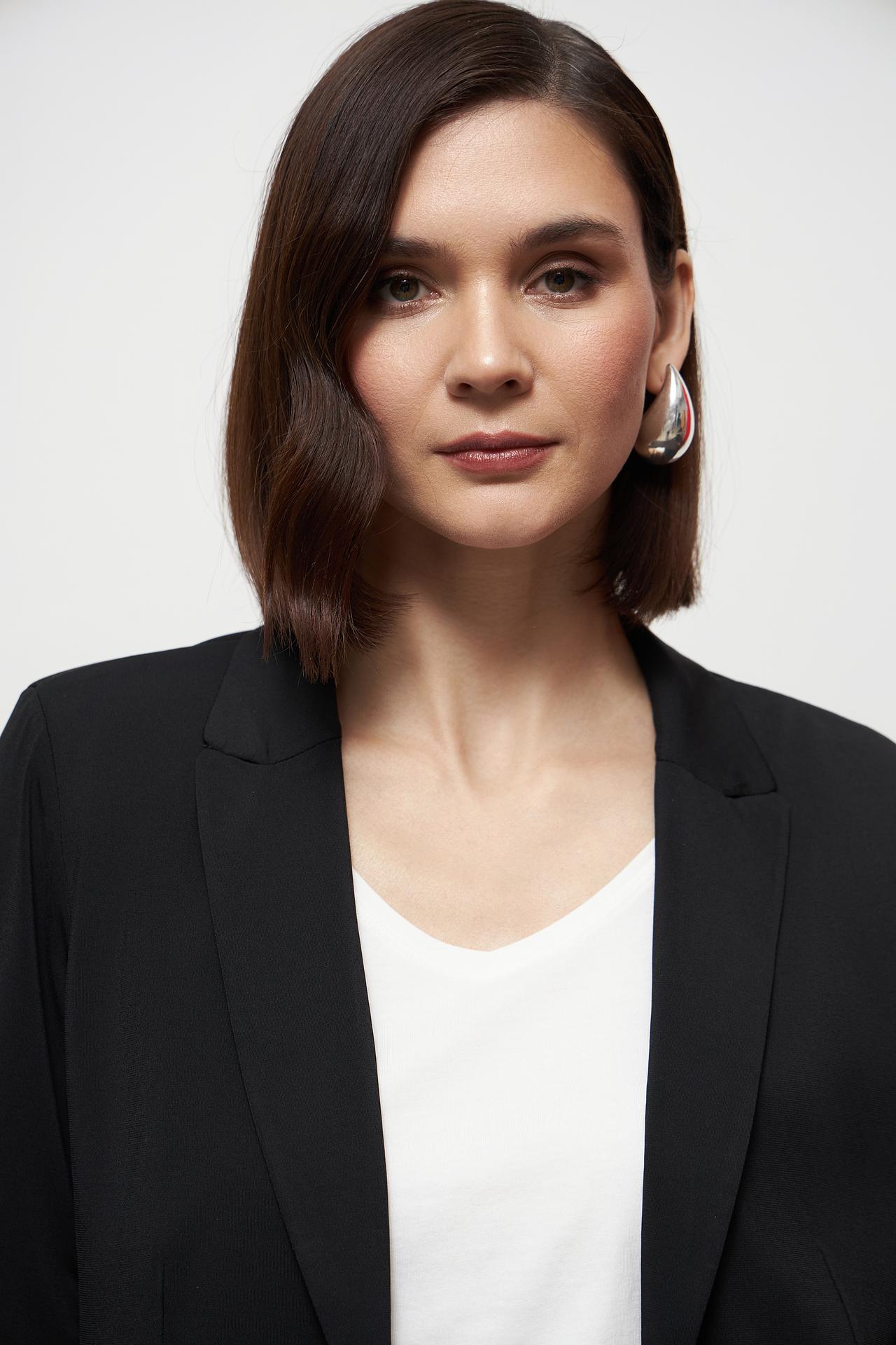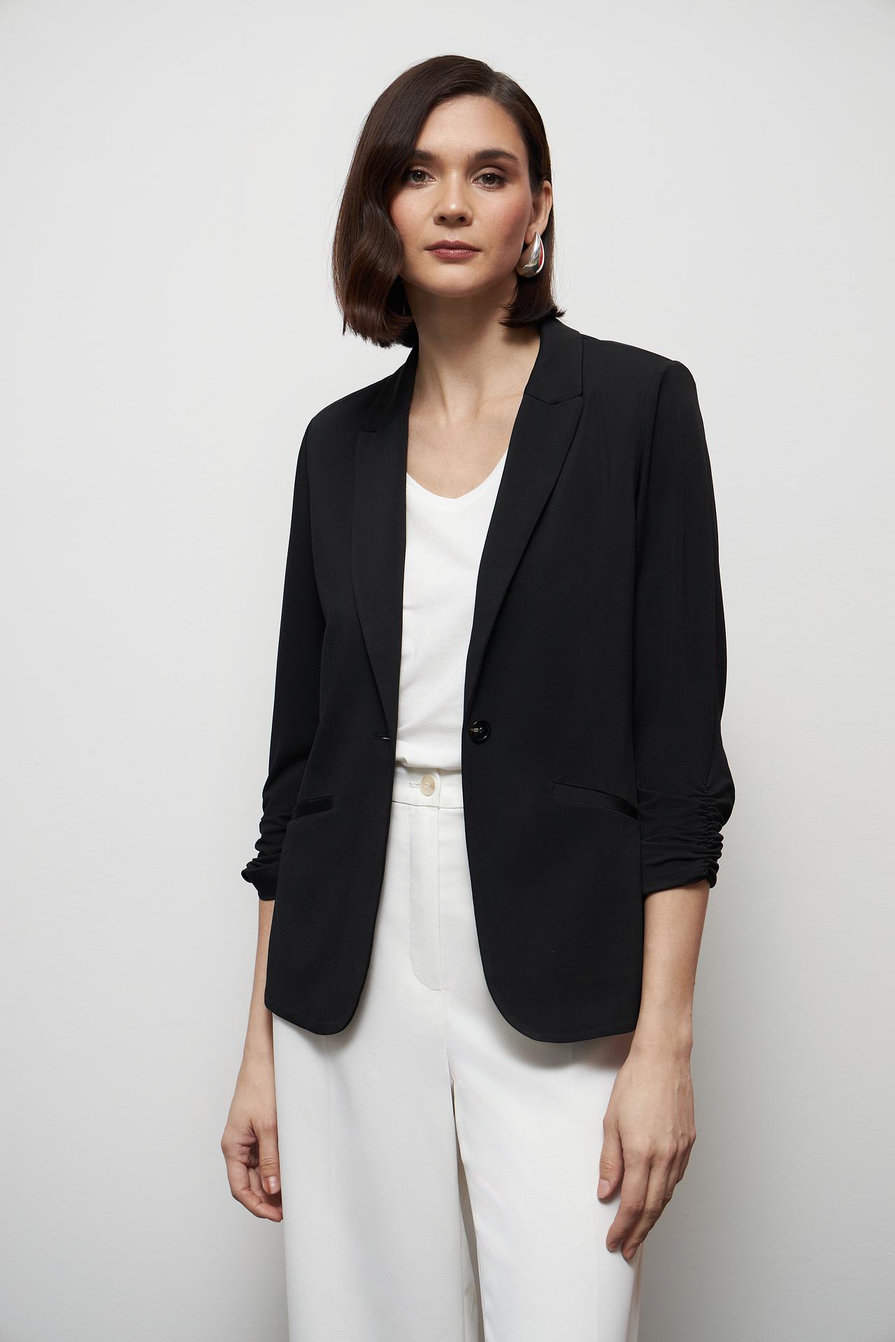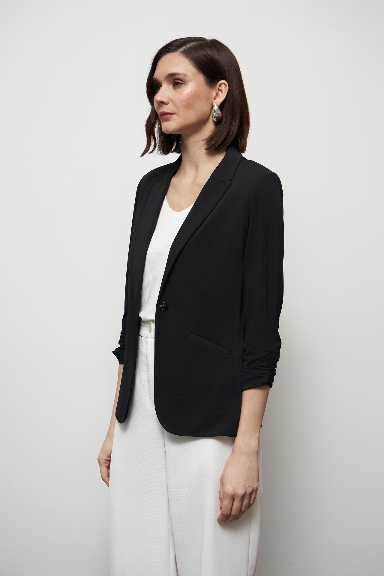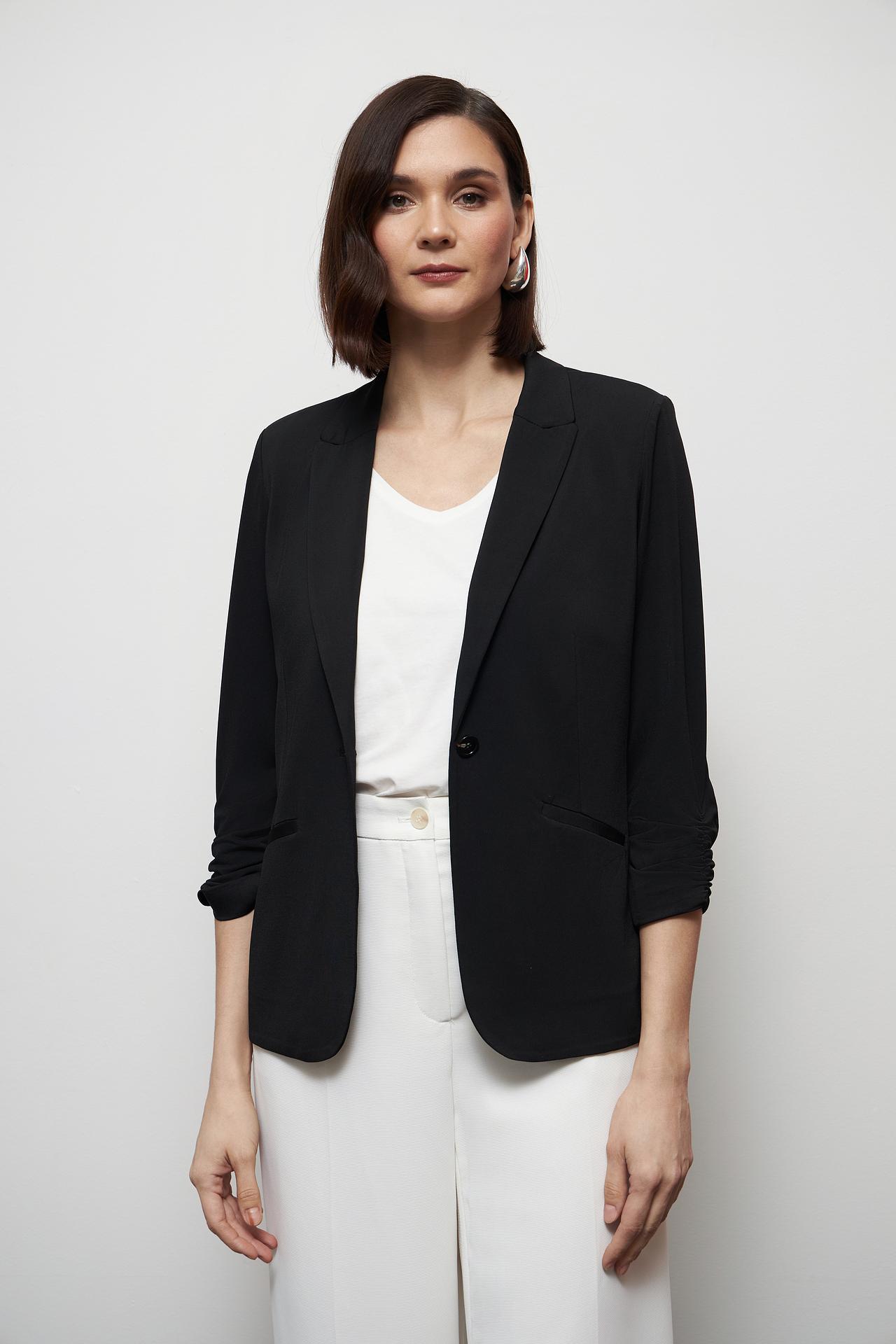 - Дизайн: Классический крой с лацканами и застежкой на одну пуговицу. Рукава ¾ с эффектной драпировкой придают модели особую изысканность и современный вид.