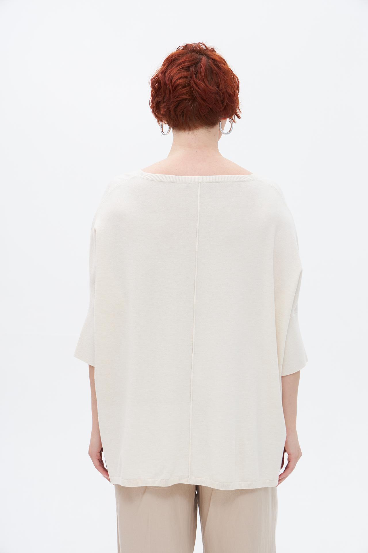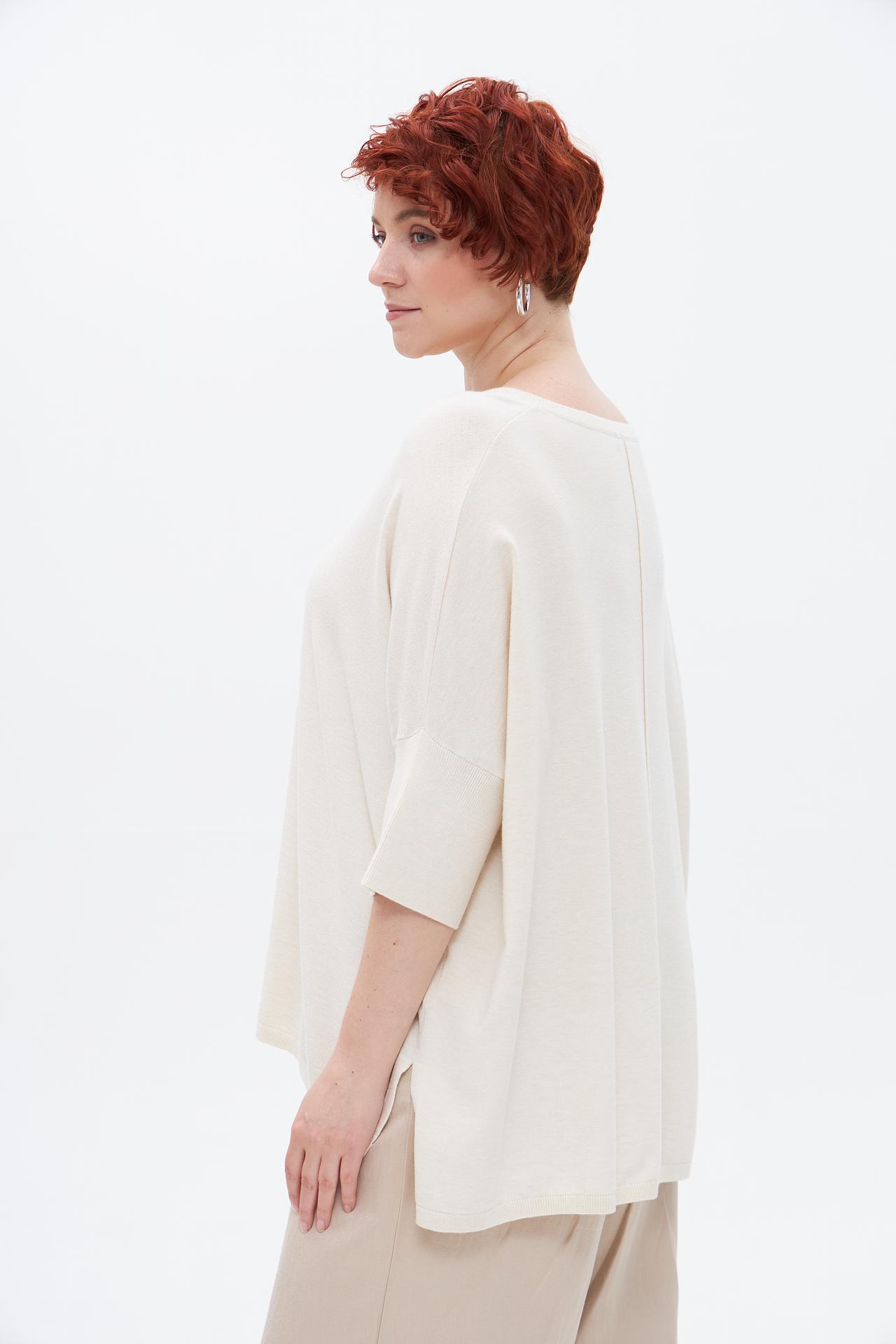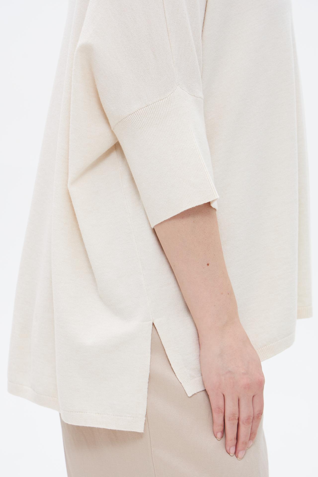 Элегантный пуловер свободного силуэта – идеальный выбор для создания непринужденного, но стильного образа. Мягкая и приятная к телу ткань из вискозы, полиамида и полиэстера обеспечивает комфорт в течение всего дня. V-образный вырез горловины добавляет женственности и позволяет носить пуловер с различными украшениями. Вертикальная вставка спереди визуально вытягивает силуэт.