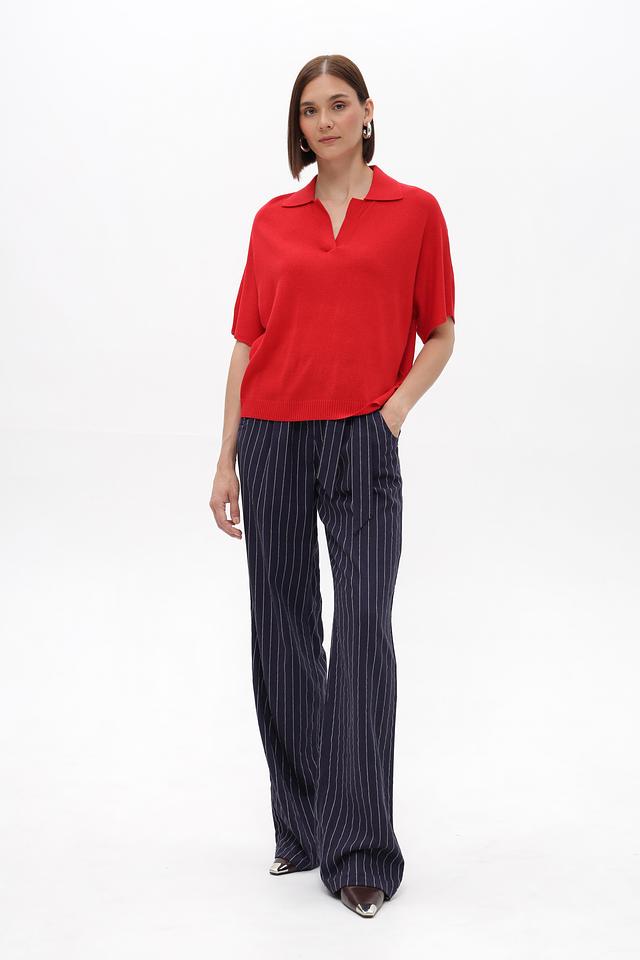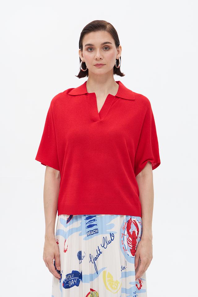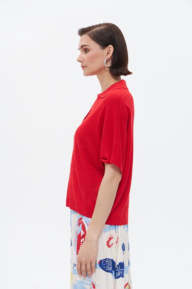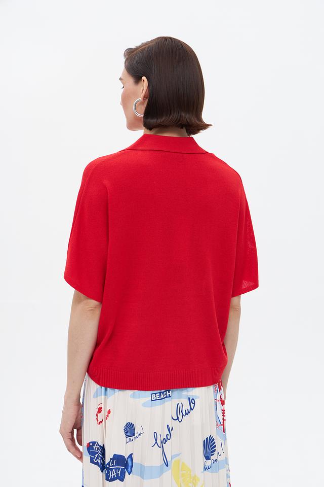 Красный пуловер от Miss Lagotte с короткими рукавами и воротником-поло. Изготовлен из сочетания полиакрила, лиоцелла и льна, обеспечивающего комфорт и воздухопроницаемость. Состав: полиакрил 58%, лиоцел 26%, лен 16%