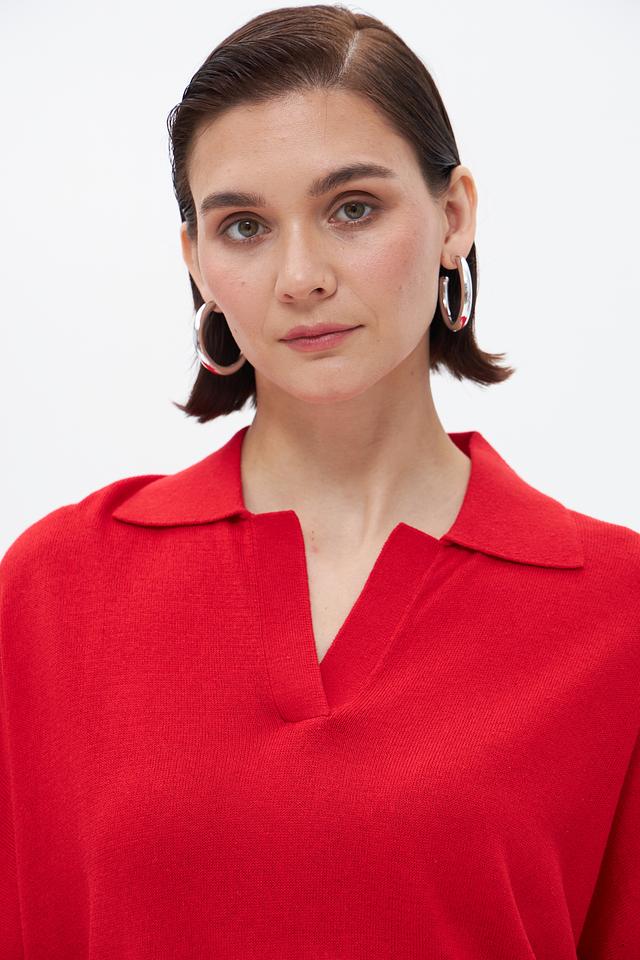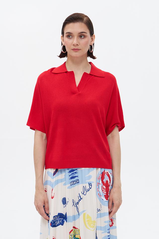 Этот стильный пуловер от Miss Lagotte станет отличным дополнением к вашему гардеробу. Яркий красный цвет и классический воротник-поло придают изделию элегантный и современный вид.