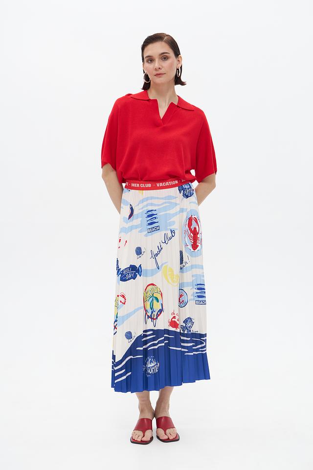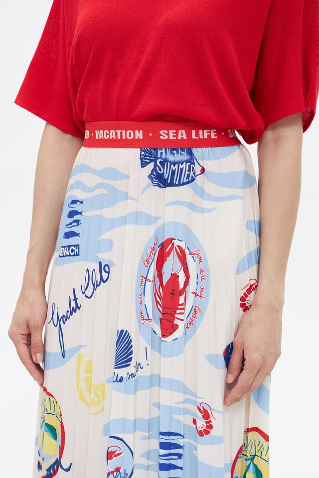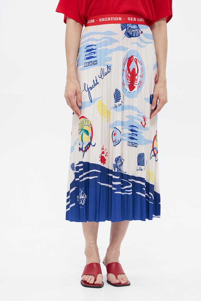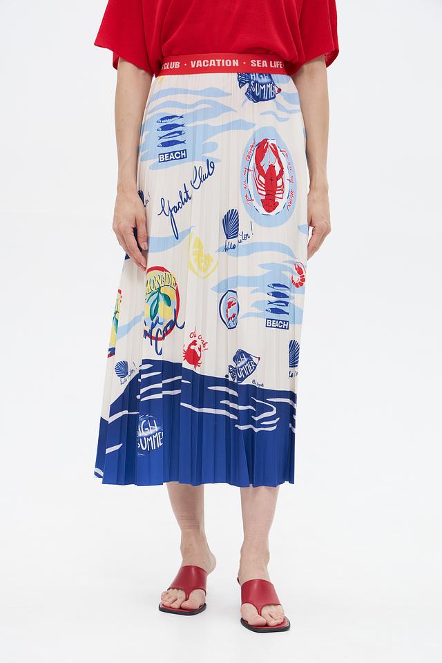 Дизайн юбки выполнен в морской тематике: на светло-голубом фоне изображены раки, морские коньки, ракушки и другие элементы, связанные с пляжным отдыхом. Юбка имеет плиссированную фактуру, которая придает ей динамичный и женственный вид.
