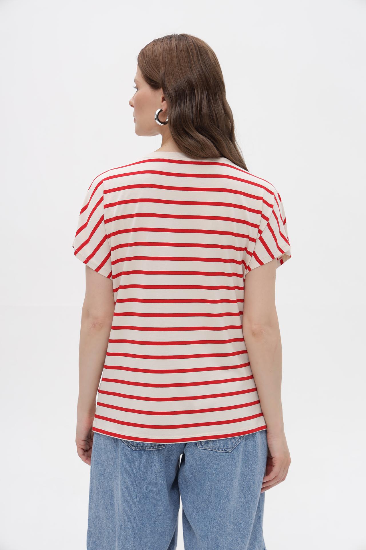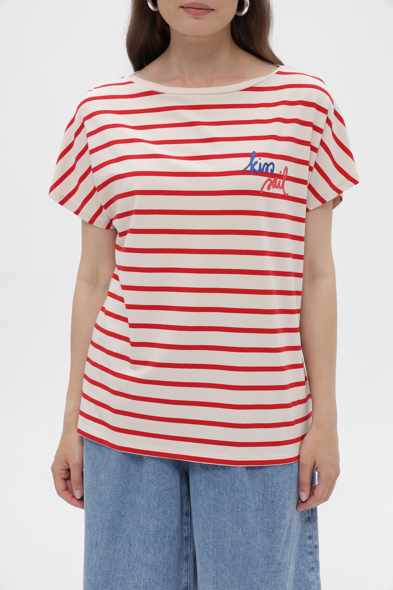 Футболка Miss Lagotte бежевая с красными полосками и вышивкой