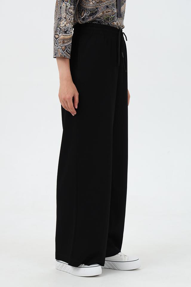Брюки имеют завышенную талию, которая визуально удлиняет ноги и подчеркивает фигуру. Удобный пояс на кулиске обеспечивает комфортную посадку и позволяет регулировать обхват талии.