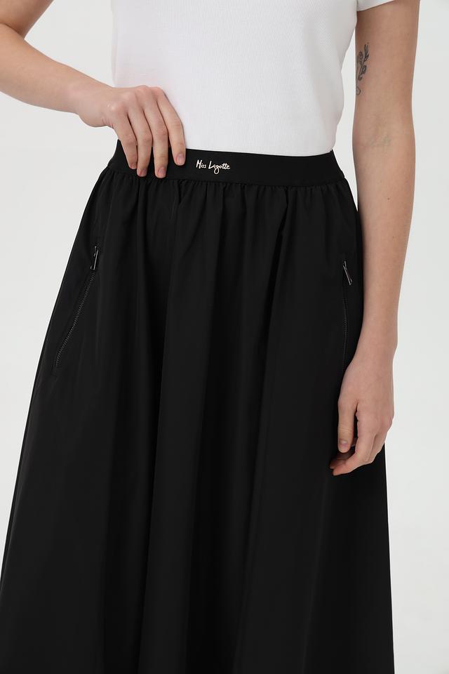 Модель имеет удобный эластичный пояс, обеспечивающий идеальную посадку по фигуре. По бокам расположены функциональные молнии, добавляющие юбке динамичности и практичности, а также боковые карманы.