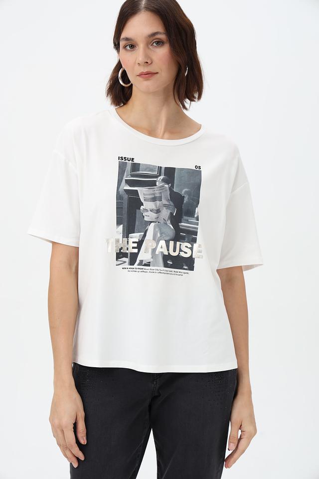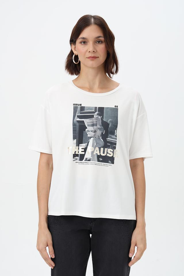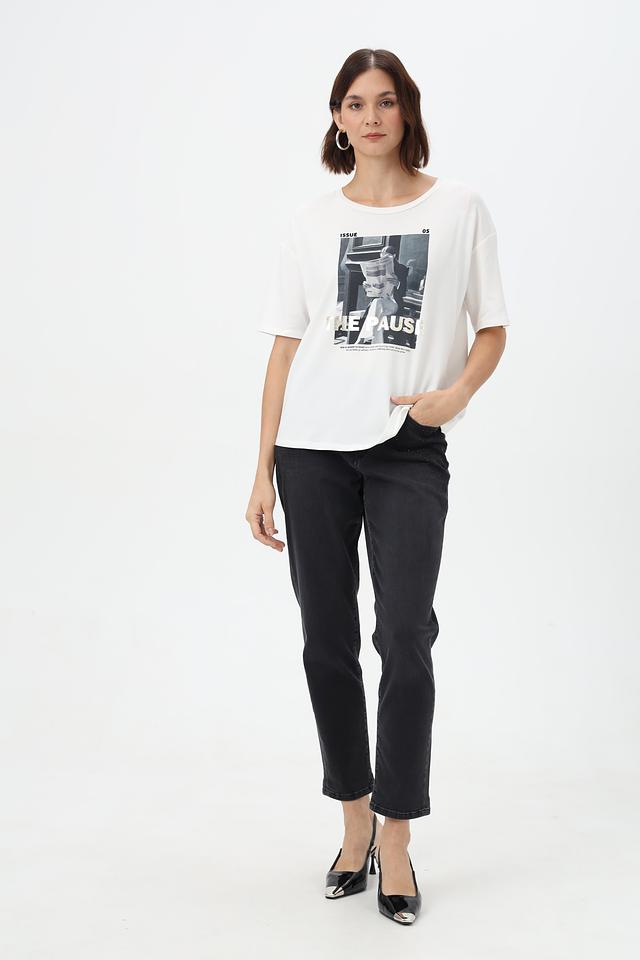 Передняя часть футболки украшена крупным графичным принтом в чёрно-белой гамме, добавляющим образу выразительности.