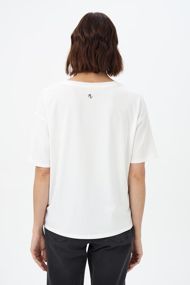 Белая футболка Miss Lagotte оверсайз кроя с графичным принтом. Модель выполнена из мягкого сочетания хлопка и модала, обеспечивающего комфорт в носке. Состав: хлопок 47%, модал 47%, эластан 6%. Состав: хлопок 47%, модал 47%, эластан 6%