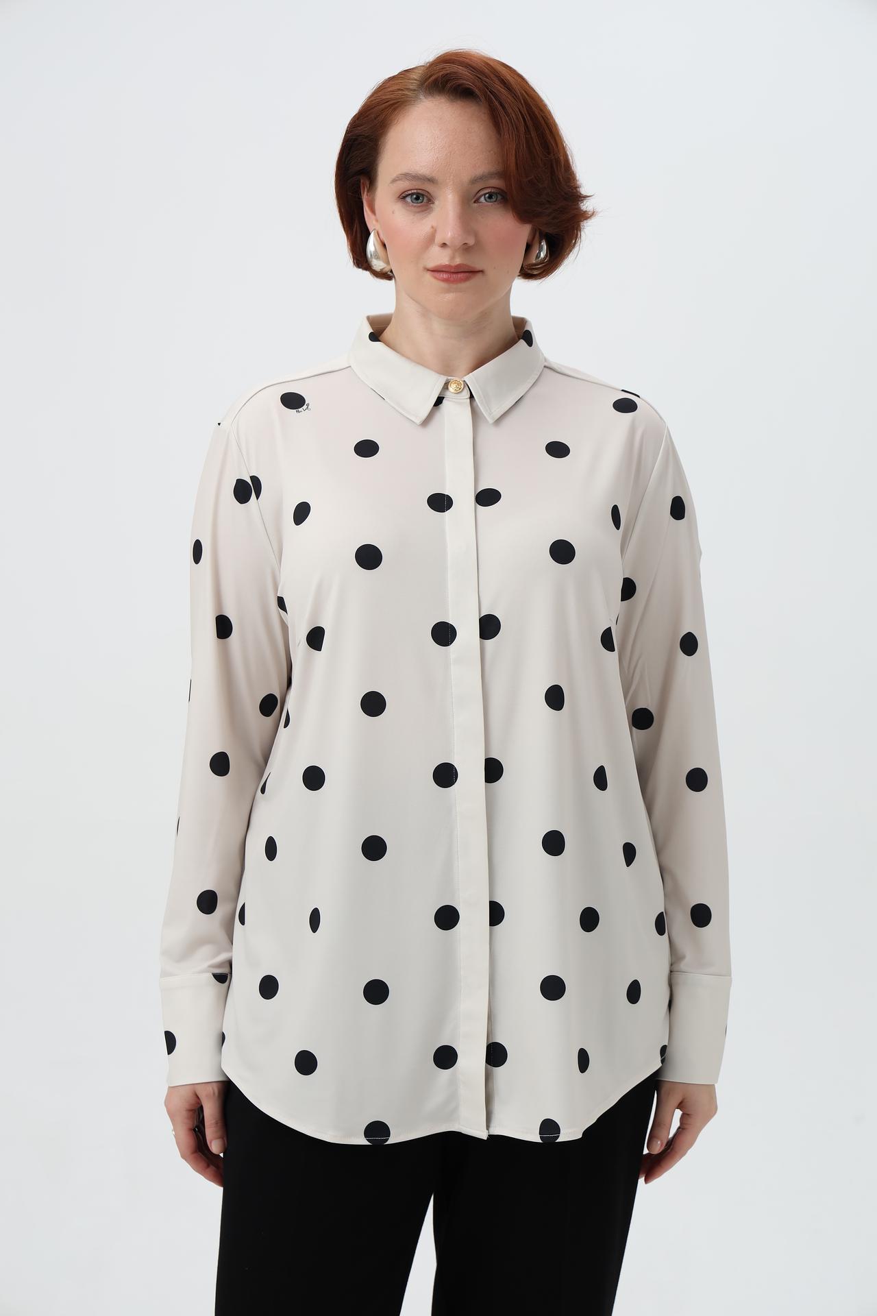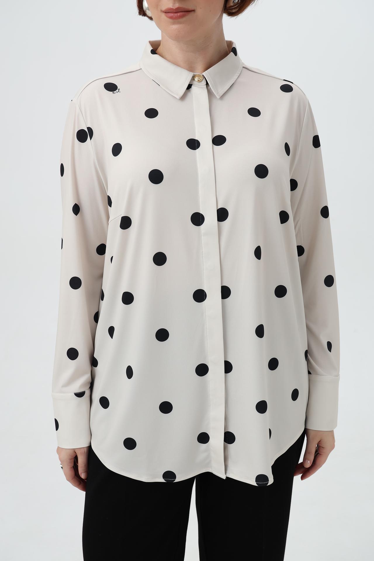 - Дизайн и принт: Модель выполнена в кремовом цвете с контрастным принтом в виде черного гороха. Этот вечный принт добавляет образу игривости и шарма, делая его актуальным вне времени. Классический отложной воротник и манжеты добавляют строгости и элегантности.