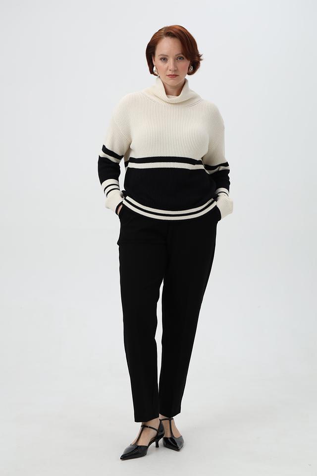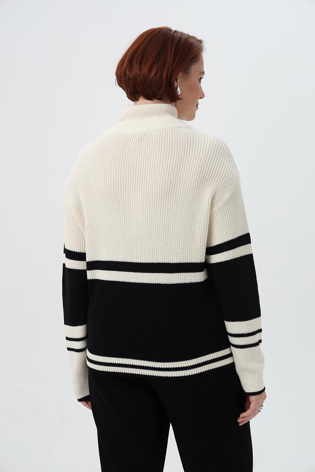 Модель выполнена в бежевом цвете с широкими контрастными полосами чёрного и белого цветов, что придает ей выразительность и динамичность.